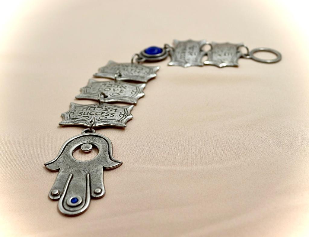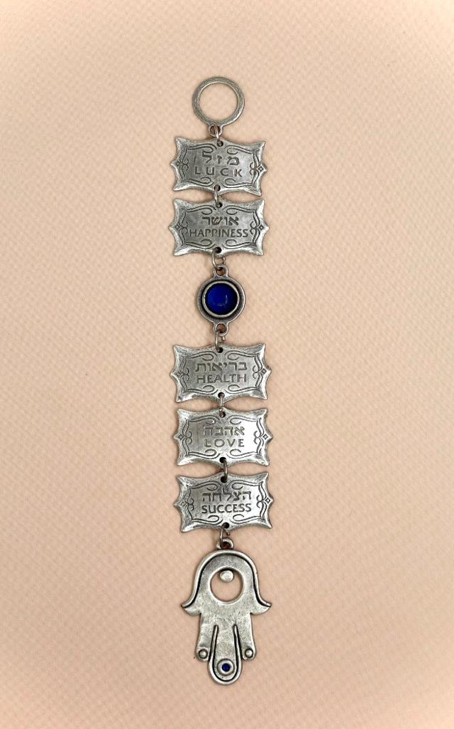 5 blessing in Hebrew and English with hamsa and blue eye against the evil eye.