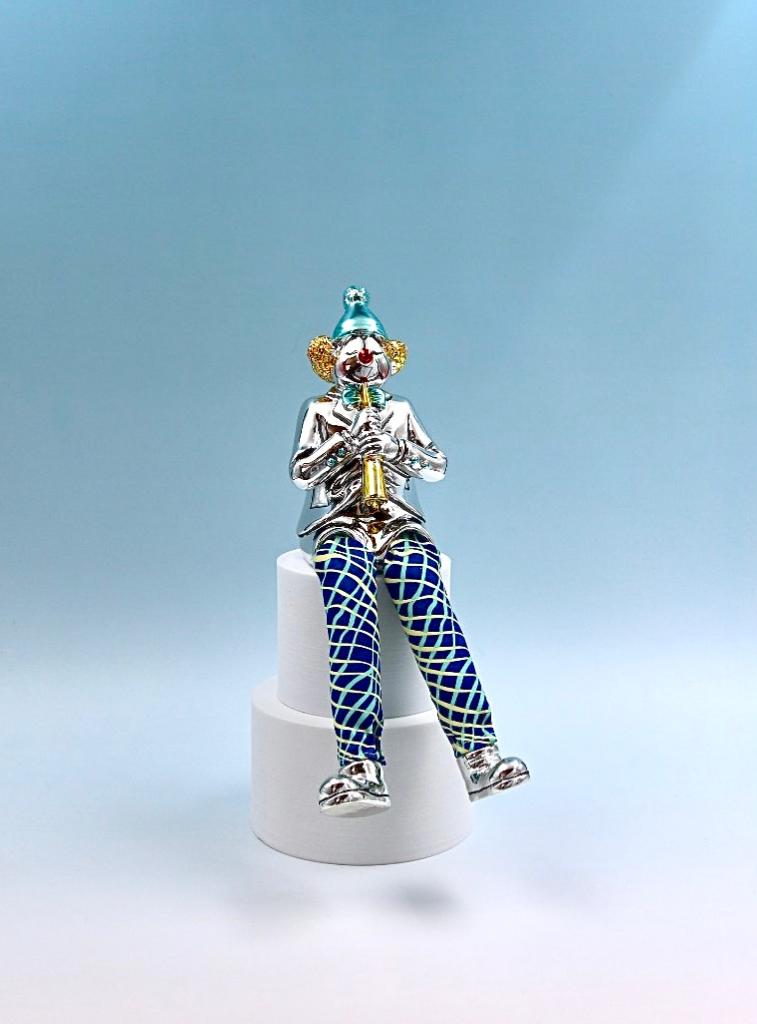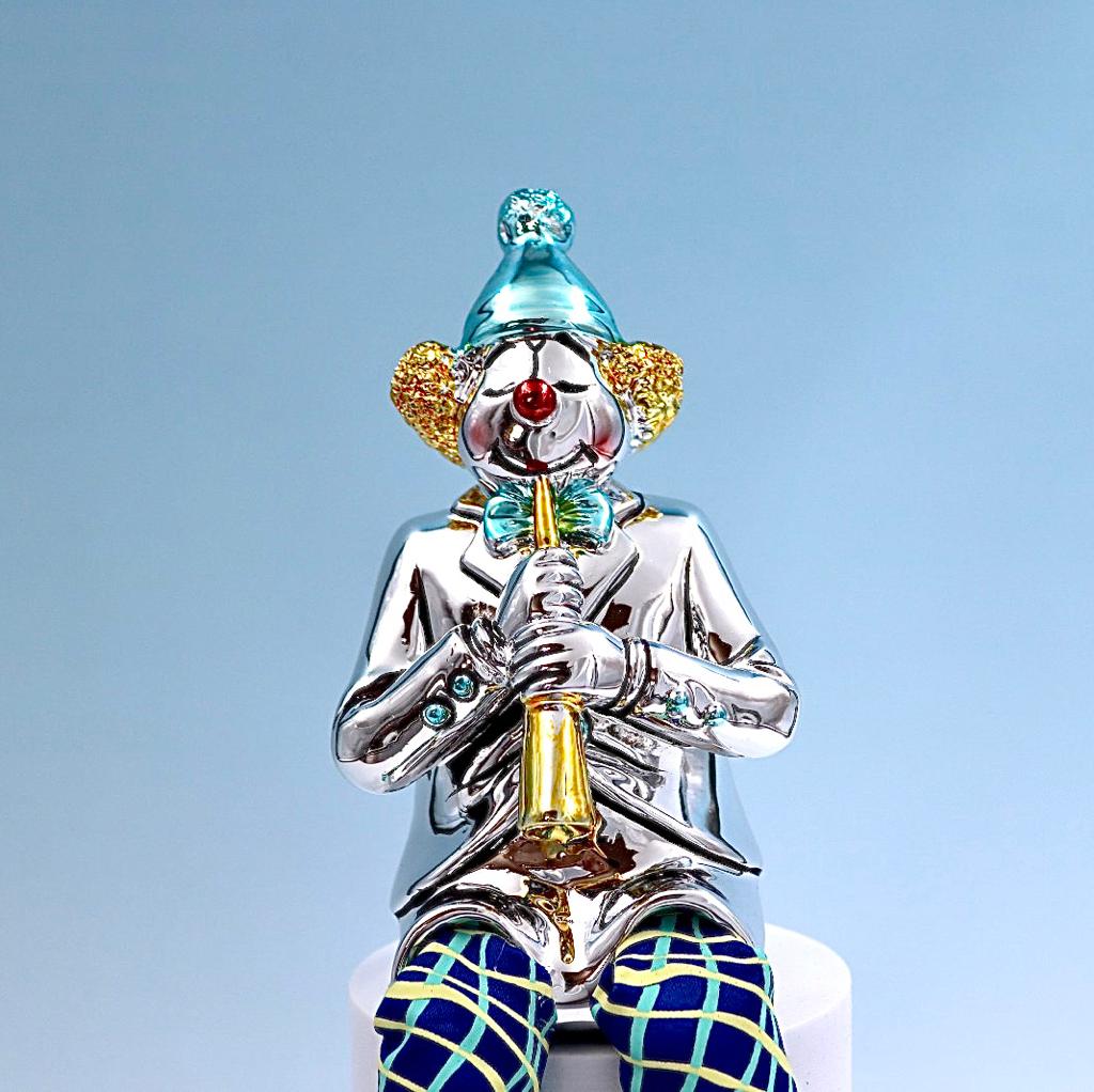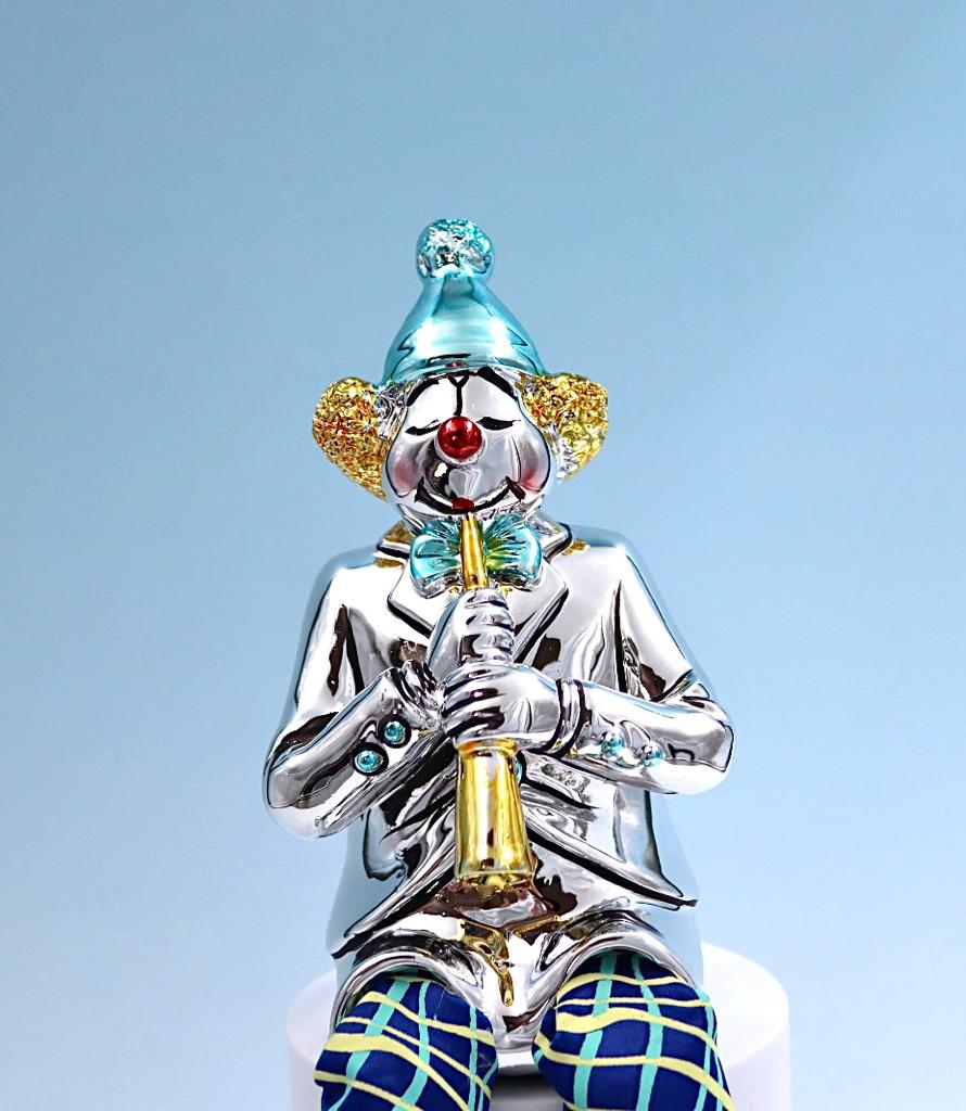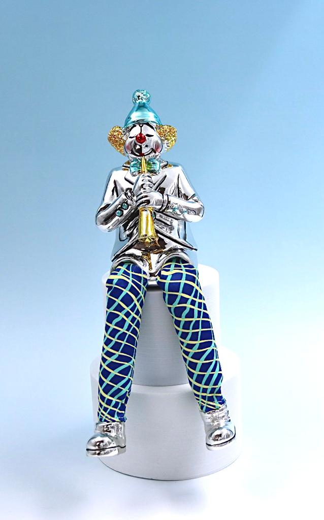 A sitting clown plays the clarinet. Made of polyresin coated with electroformed silver, with fabric legs. Hand painted. Can be placed in the living room, kitchen, bedroom and even the bathroom.