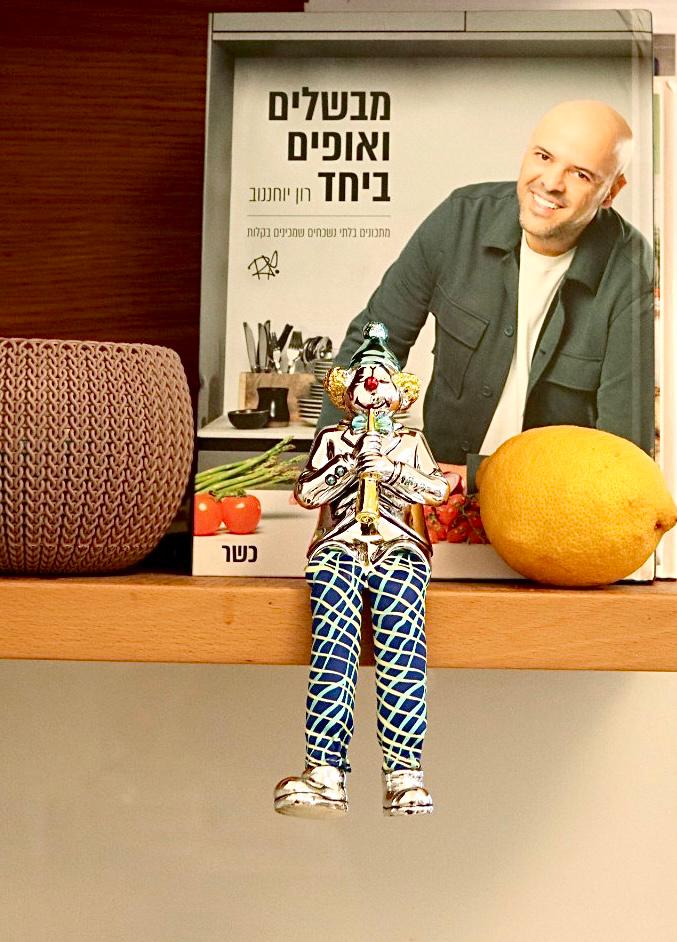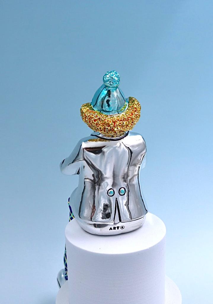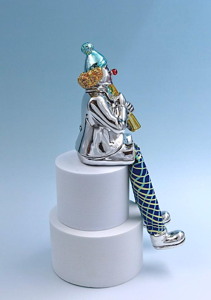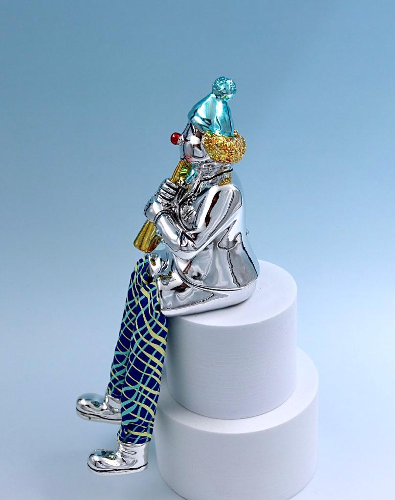 A sitting clown plays the clarinet. Made of polyresin coated with electroformed silver, with fabric legs. Hand painted. Can be placed in the living room, kitchen, bedroom and even the bathroom.