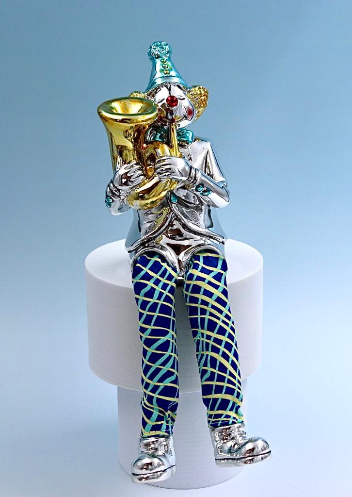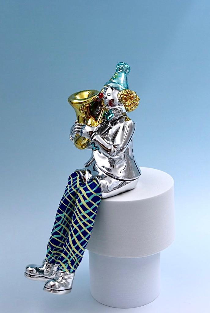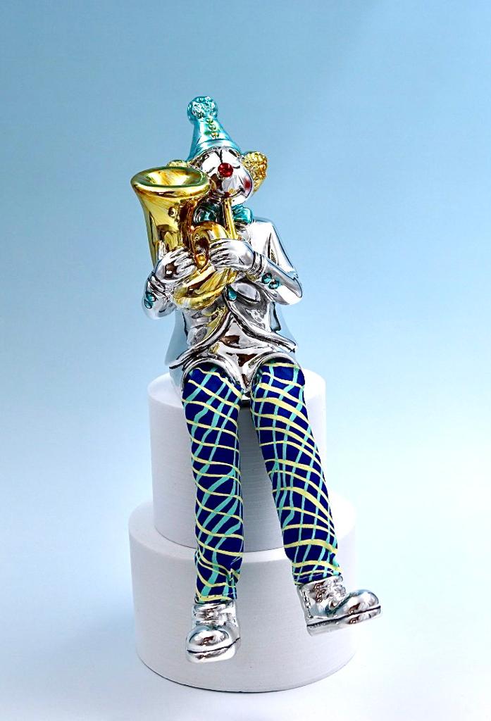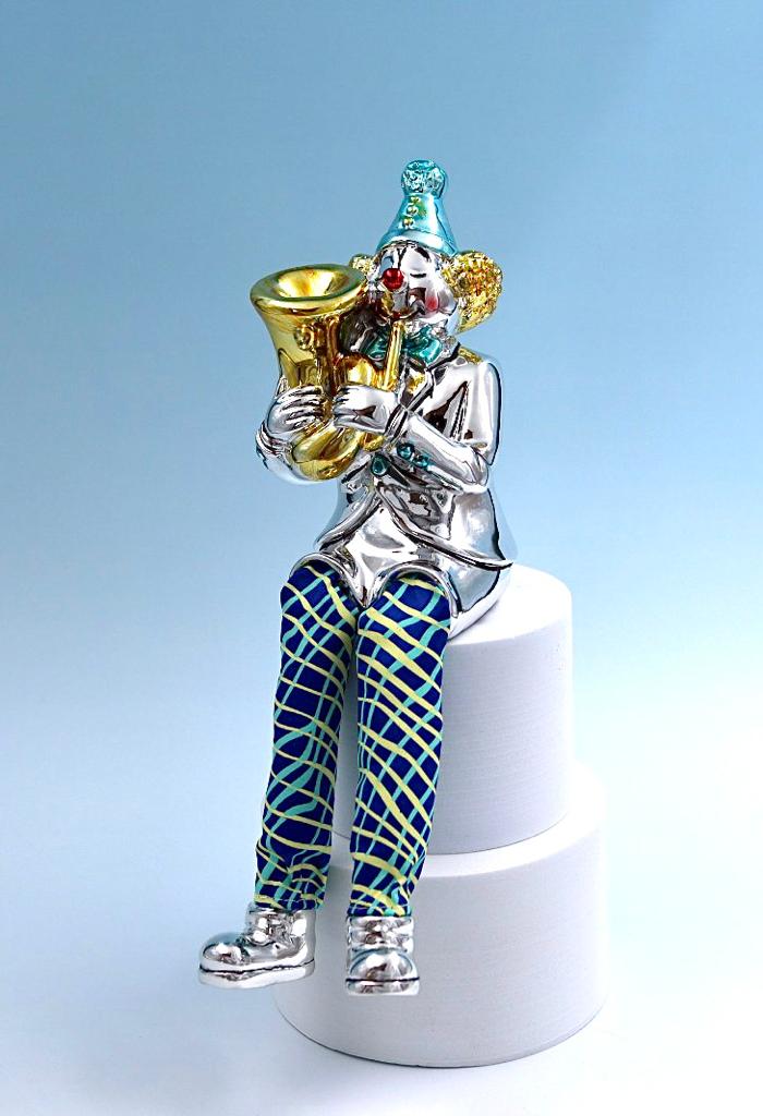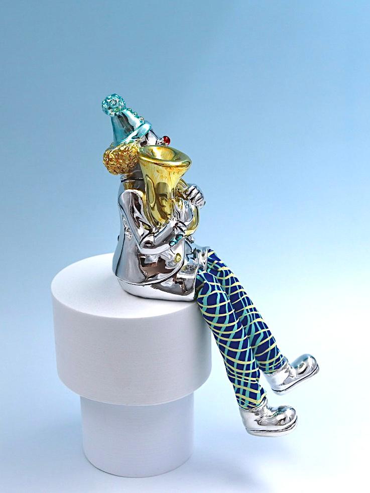 A sitting clown plays the tuba. Made of polyresin coated with electroformed silver, with fabric legs. Hand painted. Can sit in the living room, kitchen, bedroom and even the bathroom.
