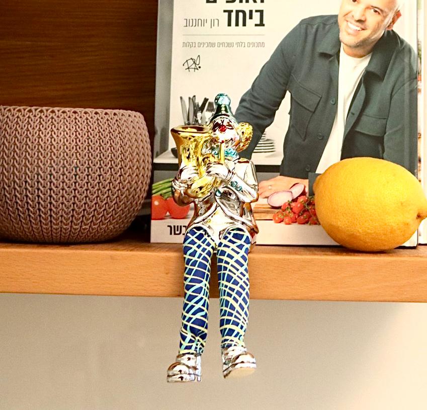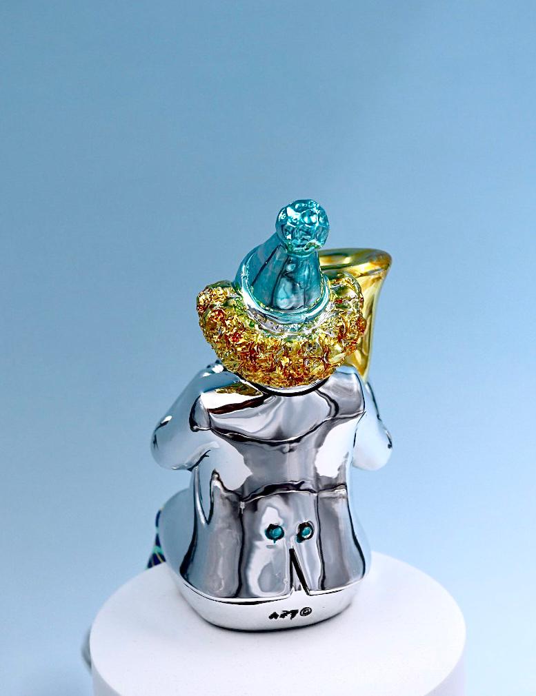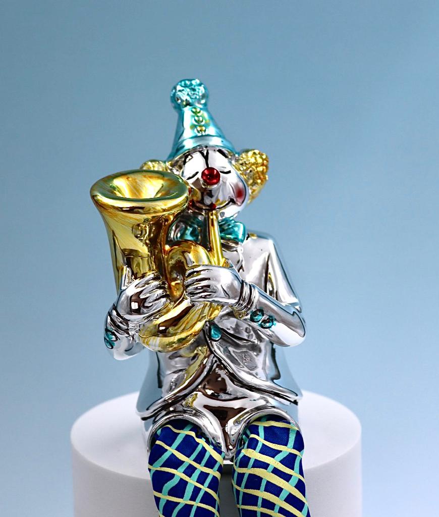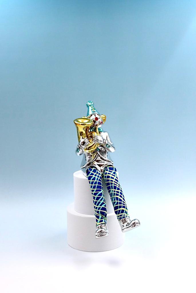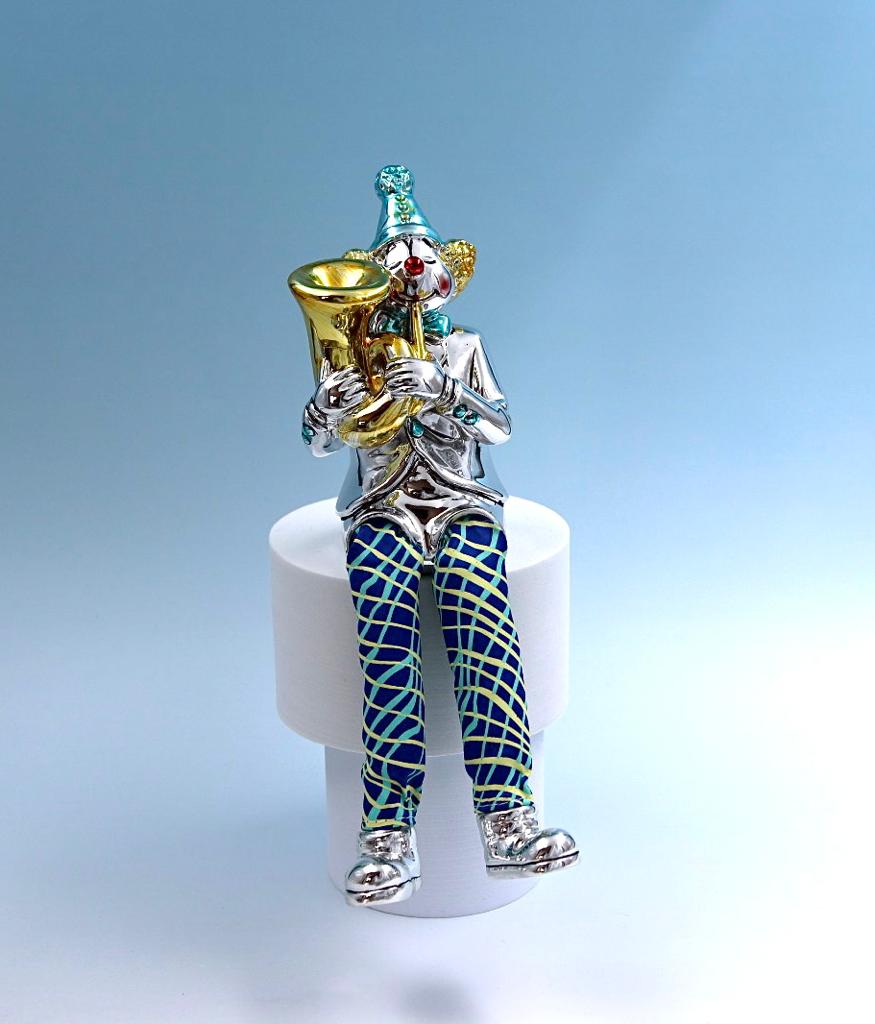 A sitting clown plays the tuba. Made of polyresin coated with electroformed silver, with fabric legs. Hand painted. Can sit in the living room, kitchen, bedroom and even the bathroom.