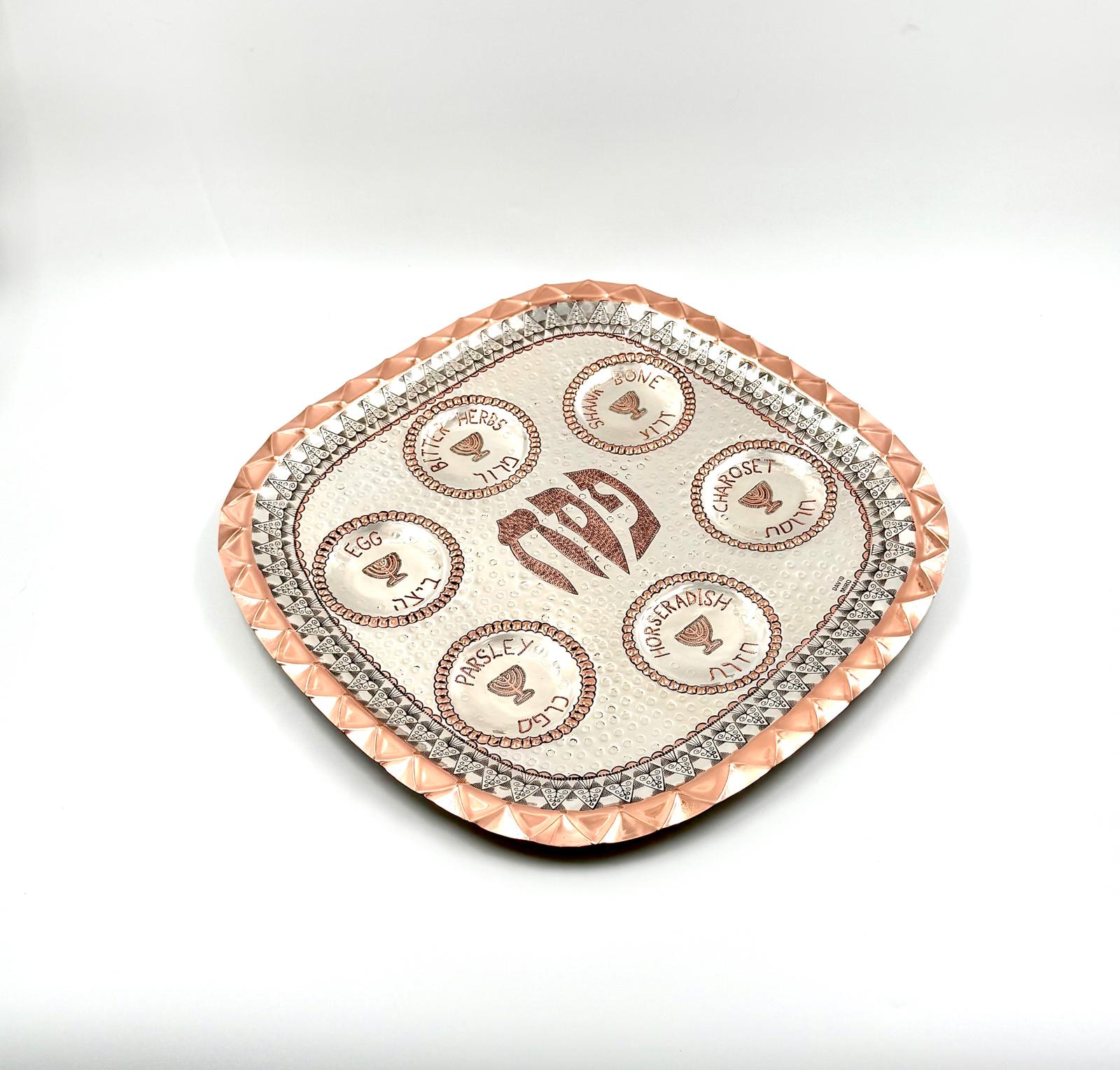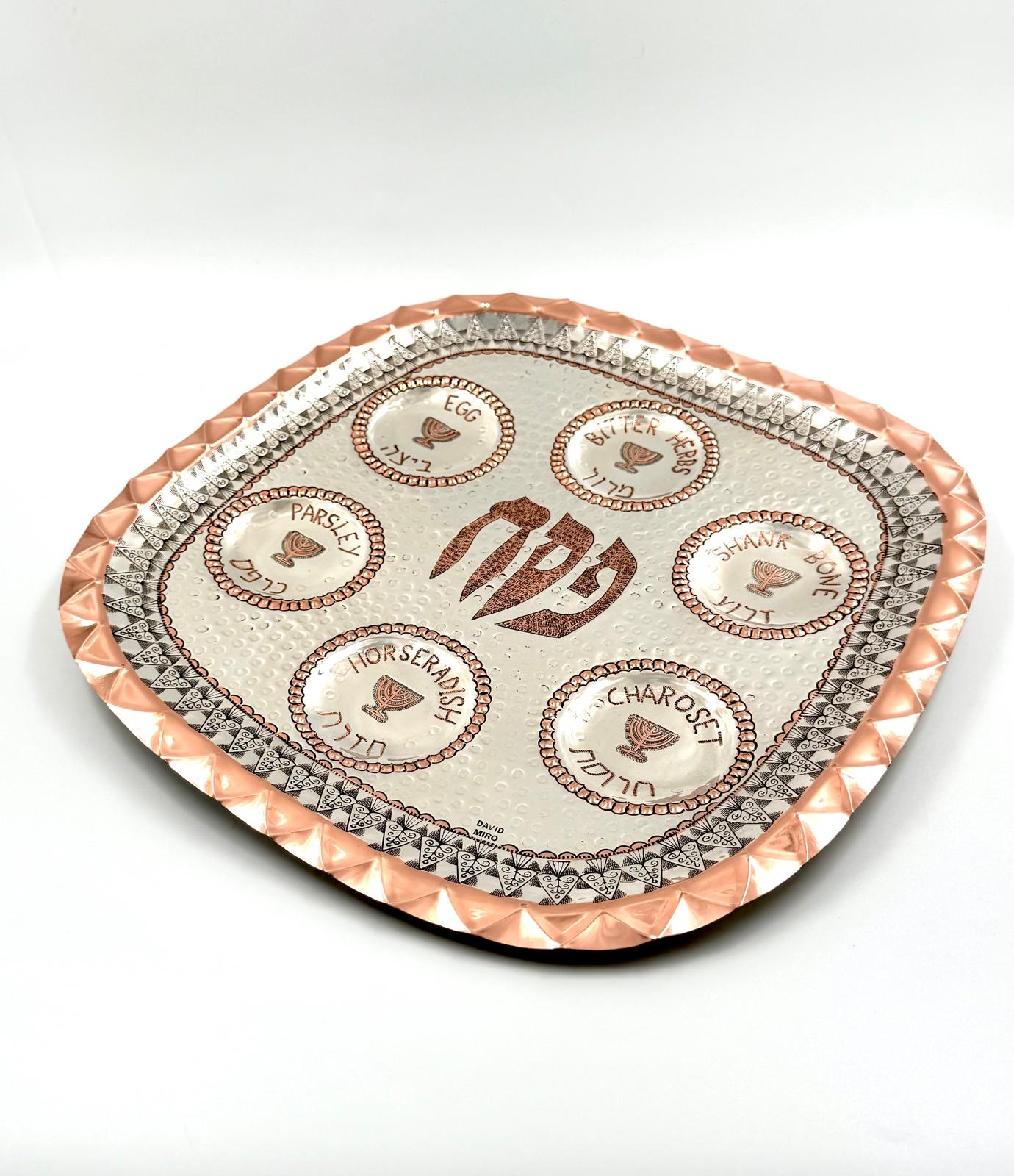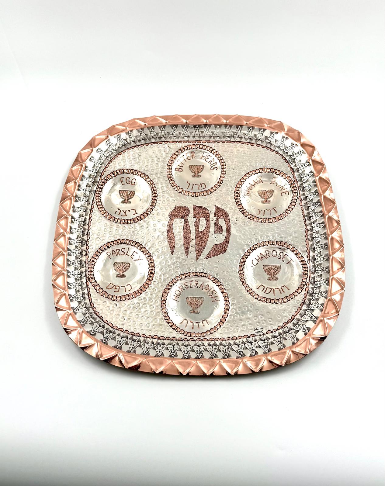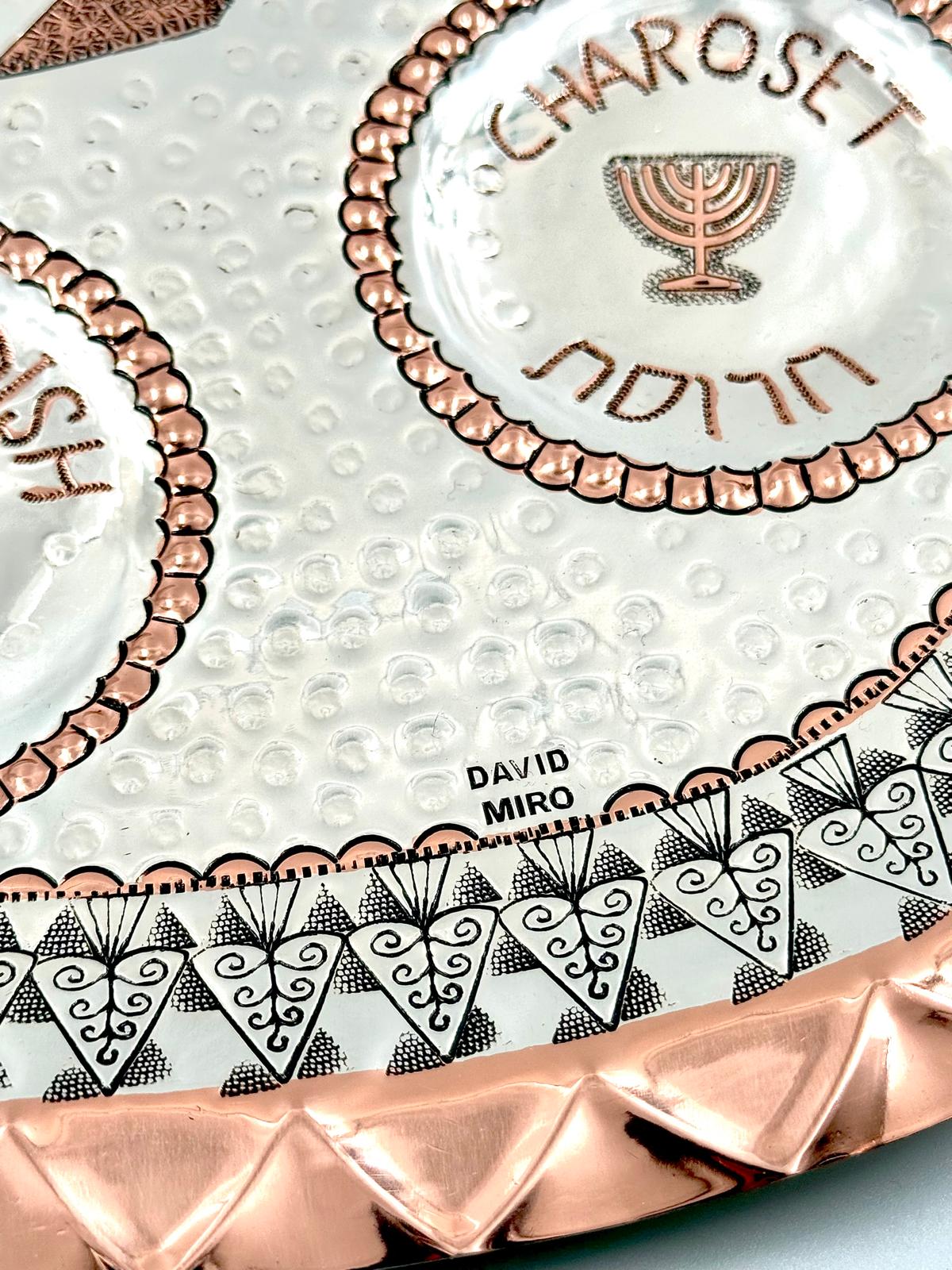 A hammered copper Passover Seder plate with silver plating. Lacquered and heated in an oven to prevent blackening.