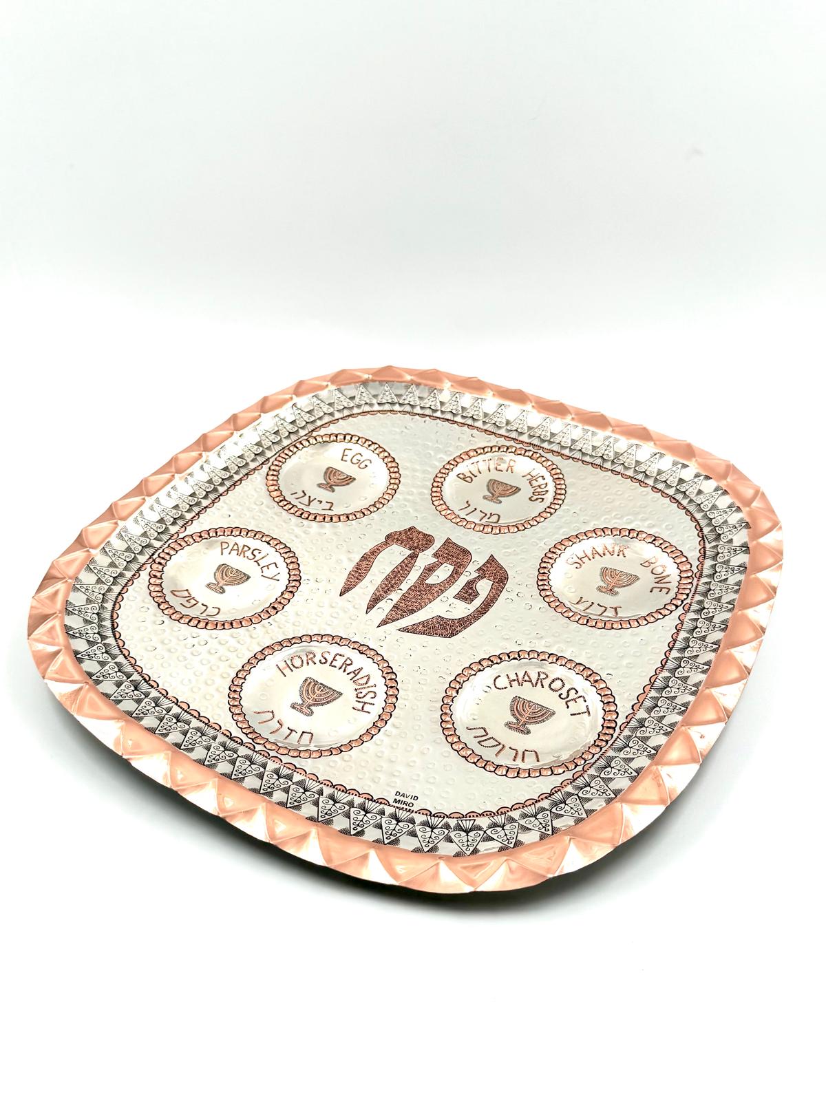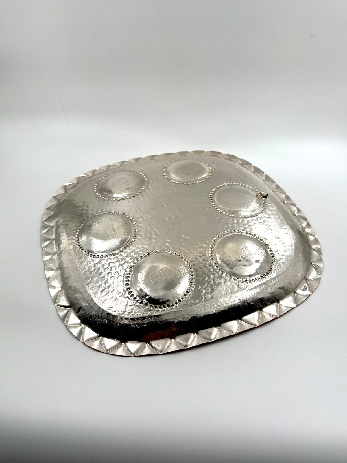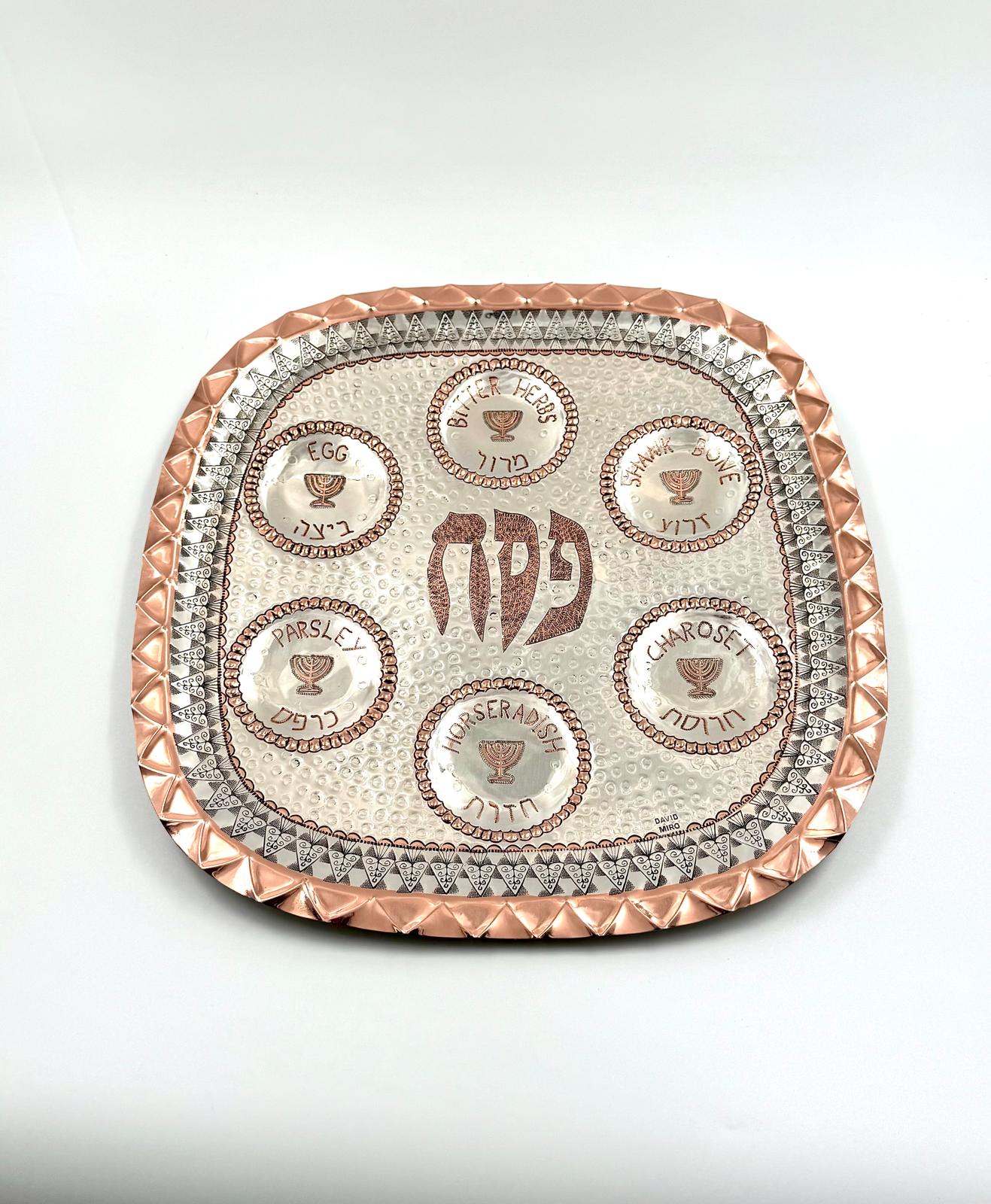 A hammered copper Passover Seder plate with silver plating. Lacquered and heated in an oven to prevent blackening.