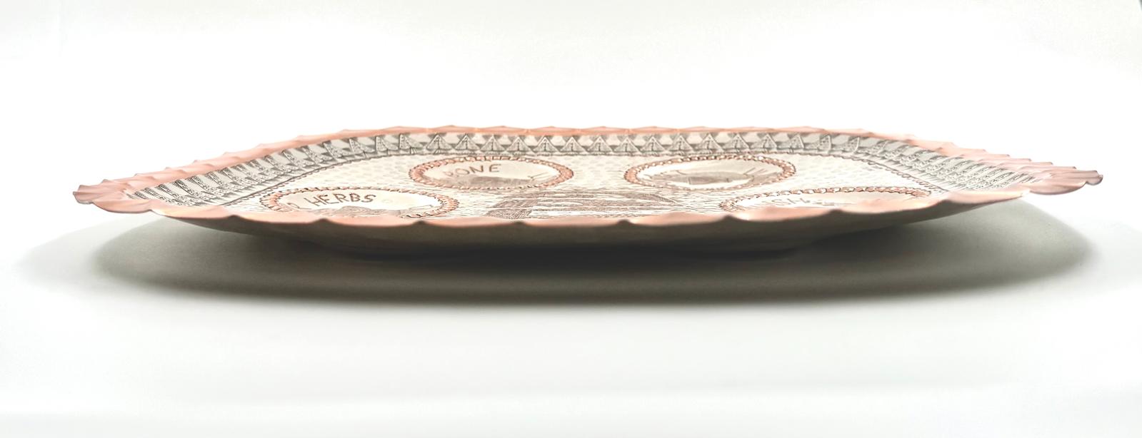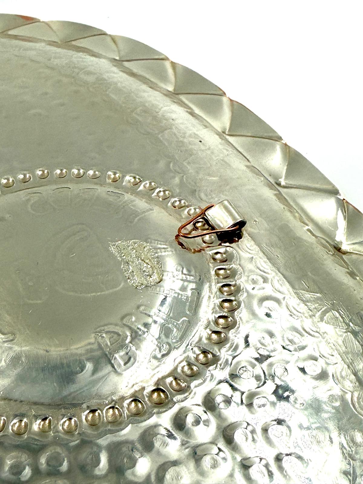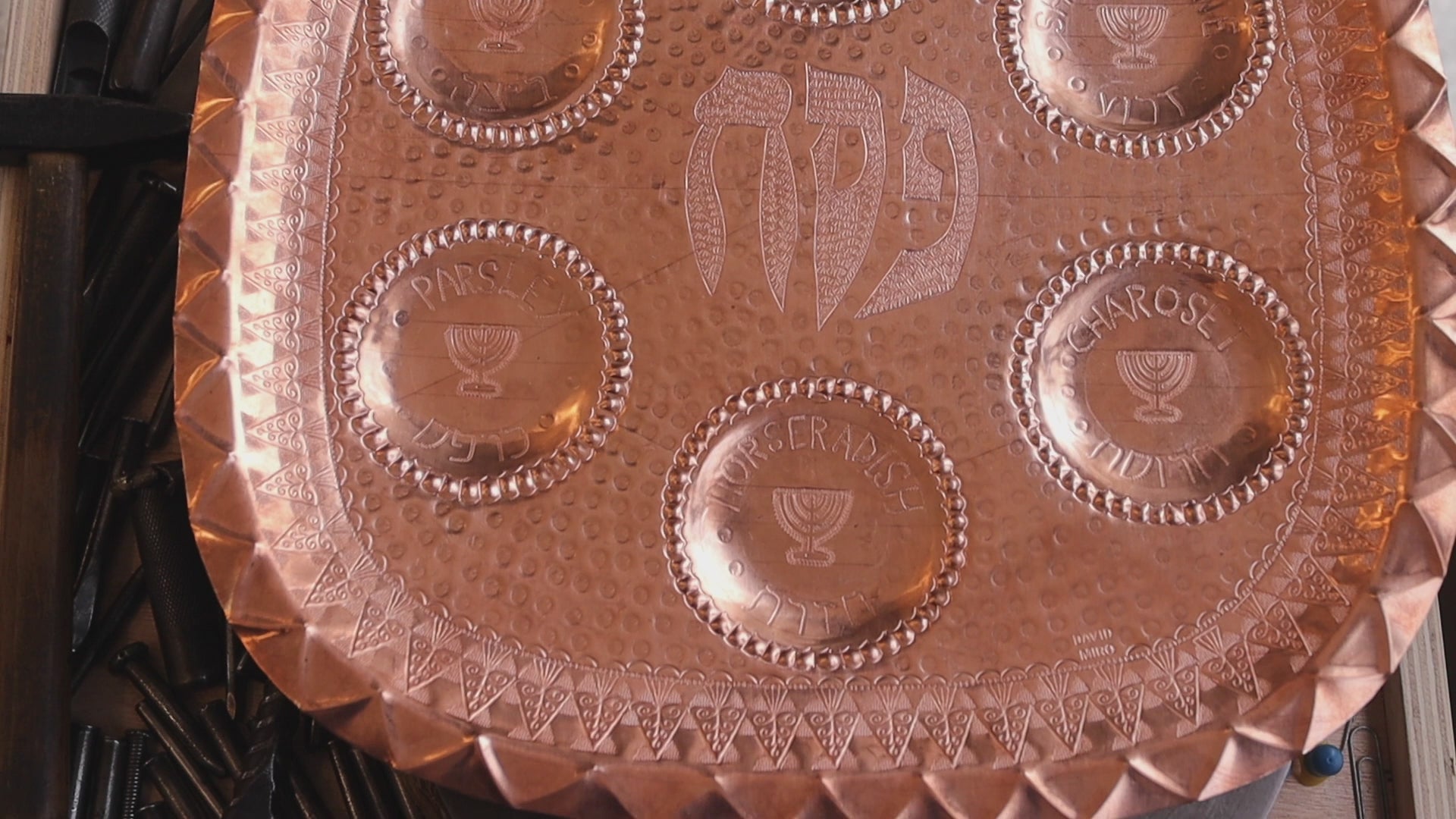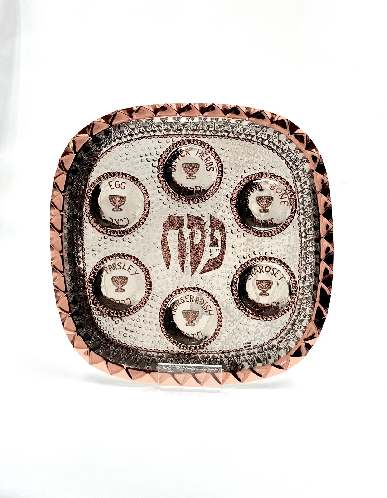 A hammered copper Passover Seder plate with silver plating. Lacquered and heated in an oven to prevent blackening.
