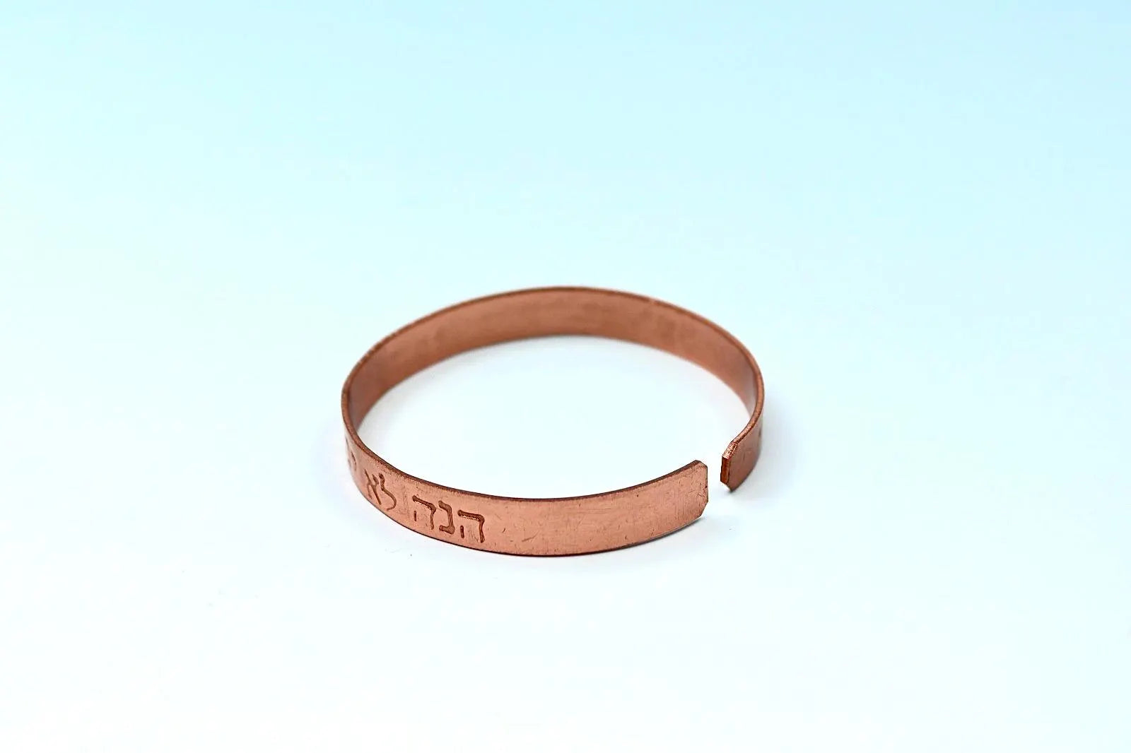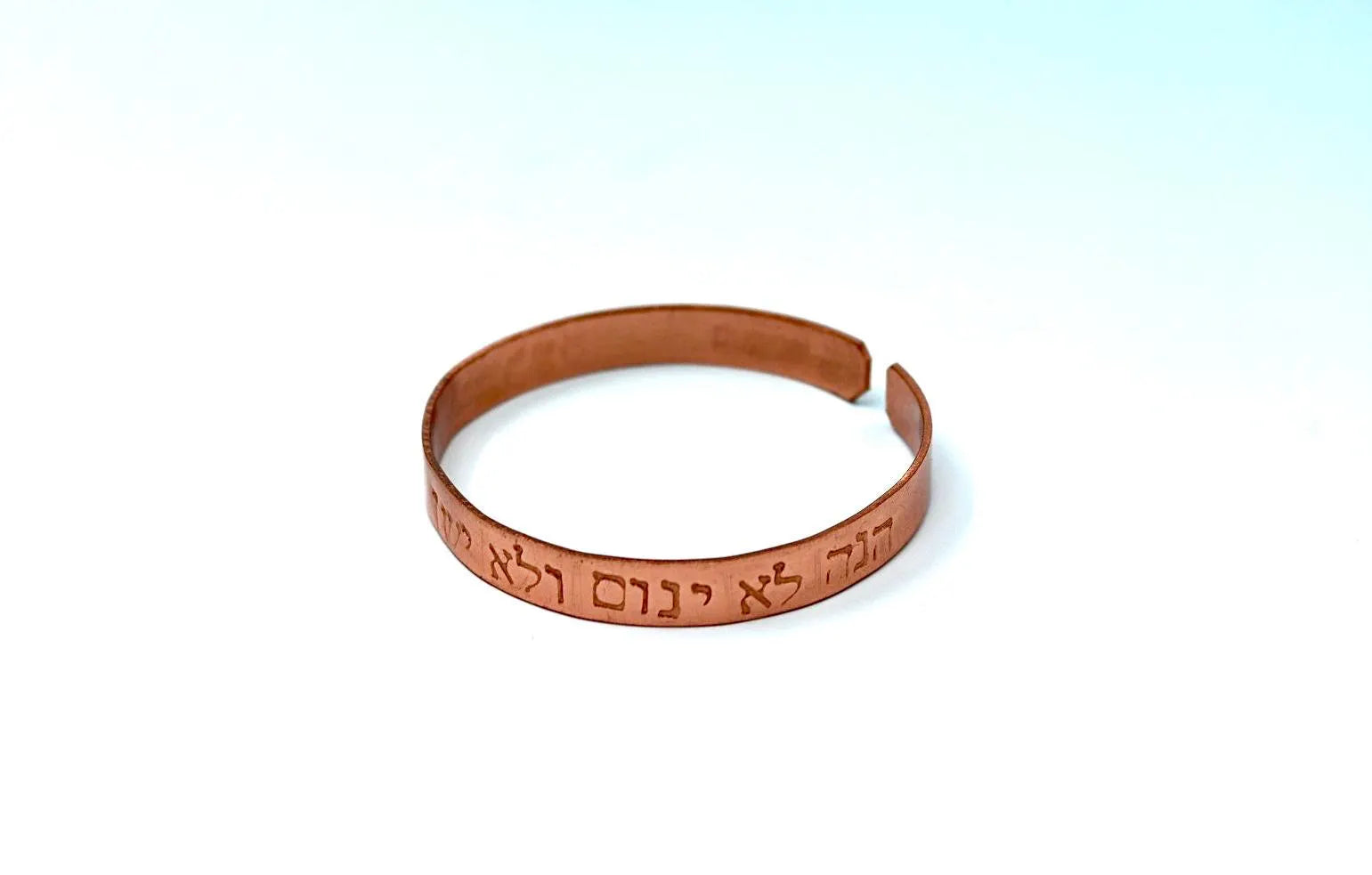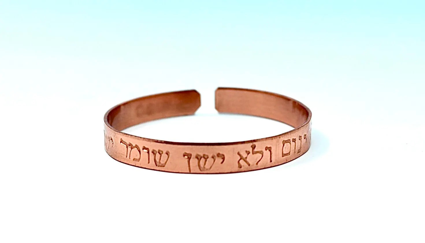 Hand-hammered copper bracelet with the inscription " Behold, He that keepeth Israel doth neither slumber nor sleep." in Hebrew
