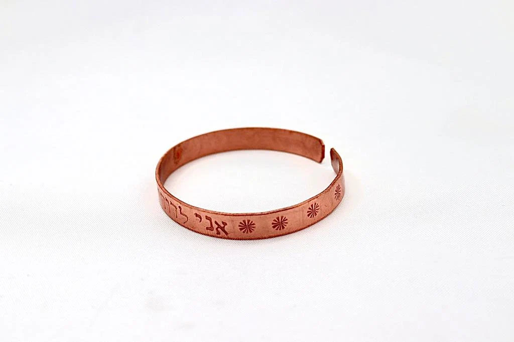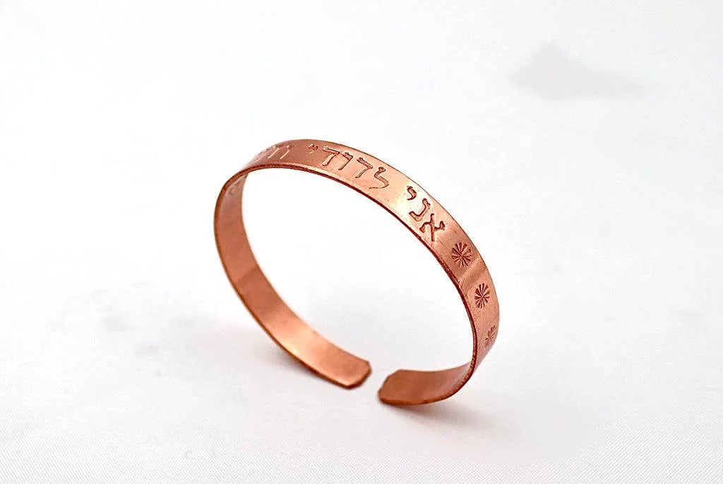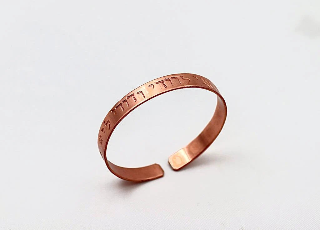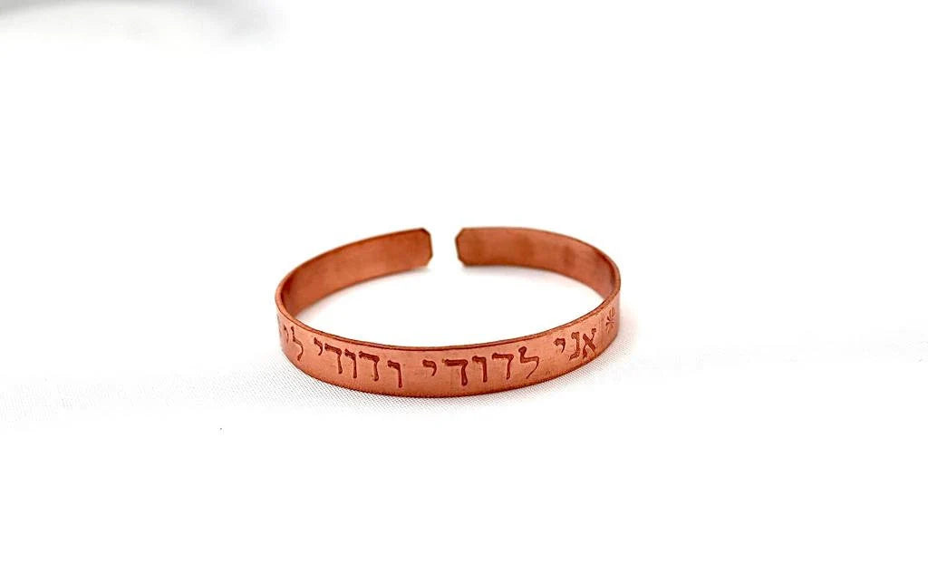 copper bracelet with: ״I am for my beloved and my beloved is for me״ in Hebrew"
