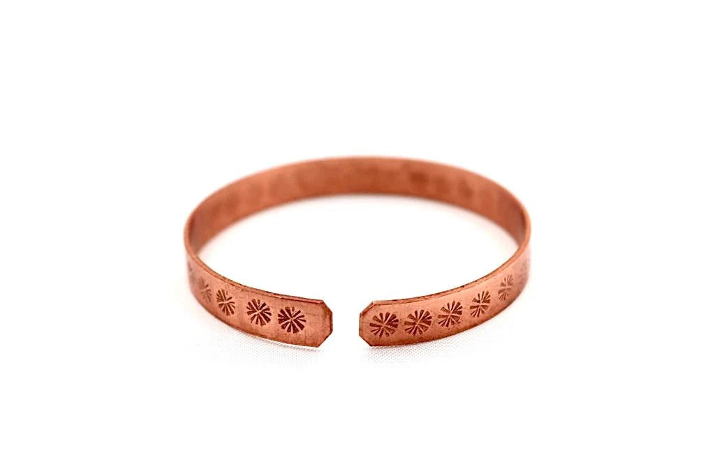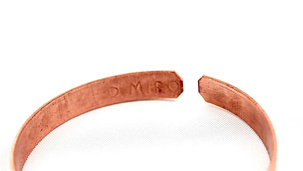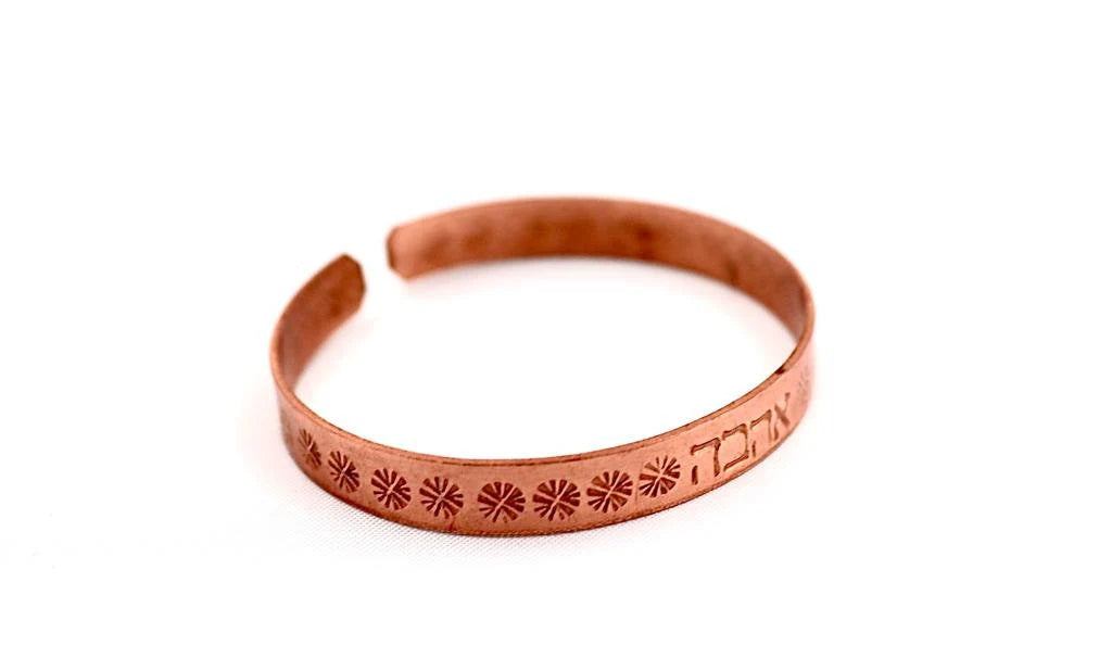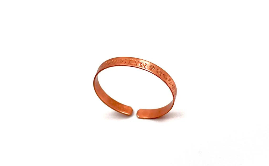 Handmade hammered copper bracelet written:״LOVE ״ in Hebrew.