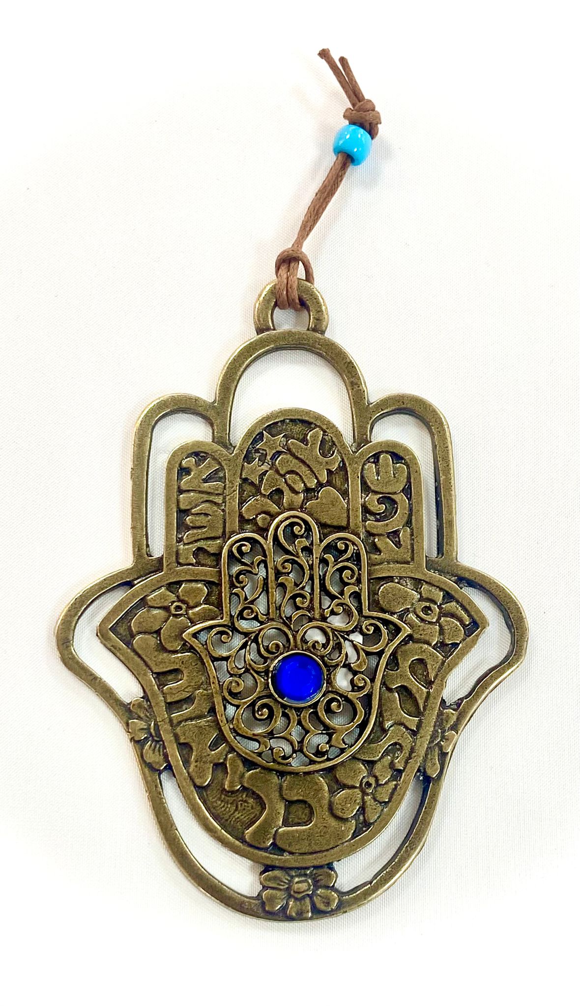 metal hamsa with bronze color. Designed with blessings in Hebrew