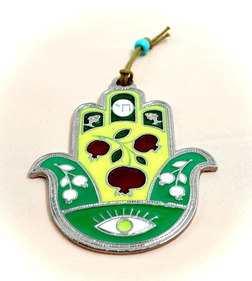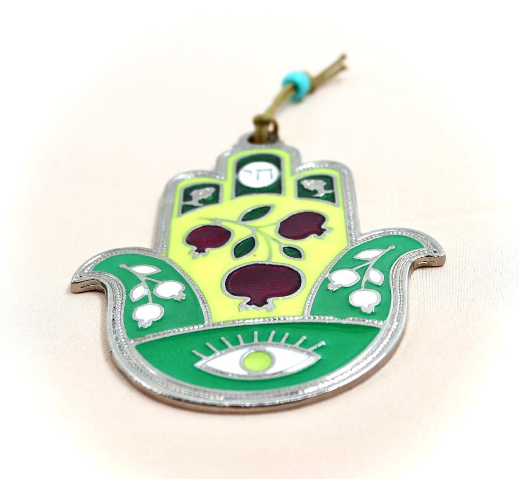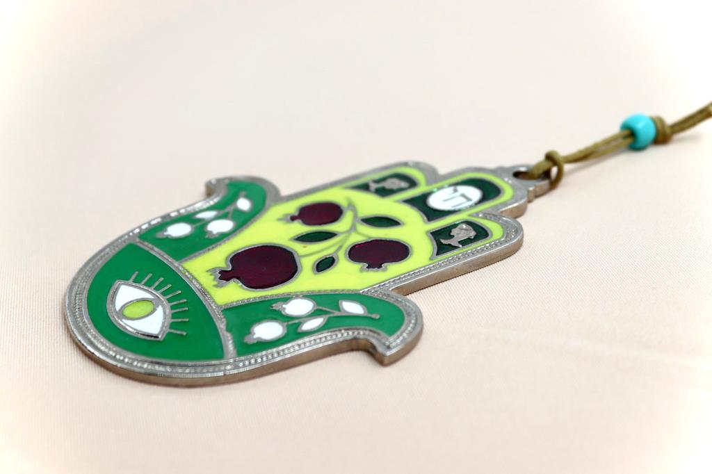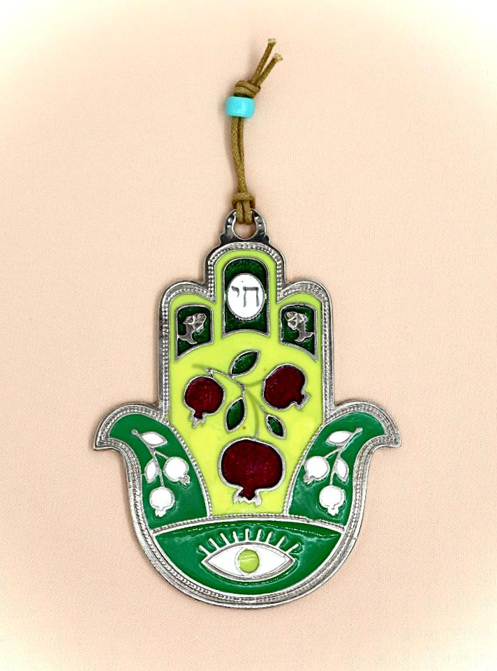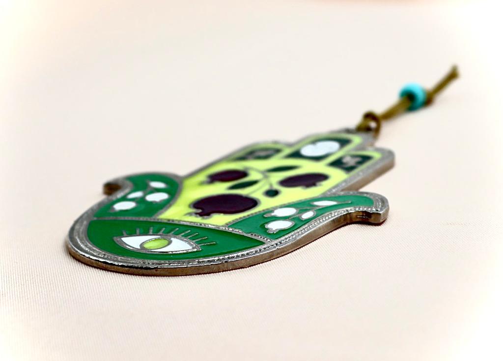 Hamsa design with pomegranate, metal with silver plate and enamel paint