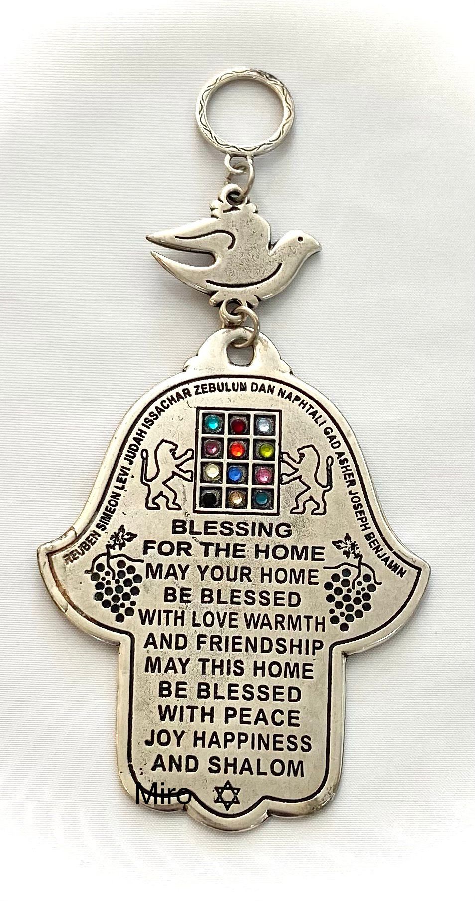 Hamsa with the dove of peace is decorated with the blessing of the house, the twelve stones of the breastplate and the names of the twelve tribes of Israel. Designed and manufactured in Israel, made of pewter