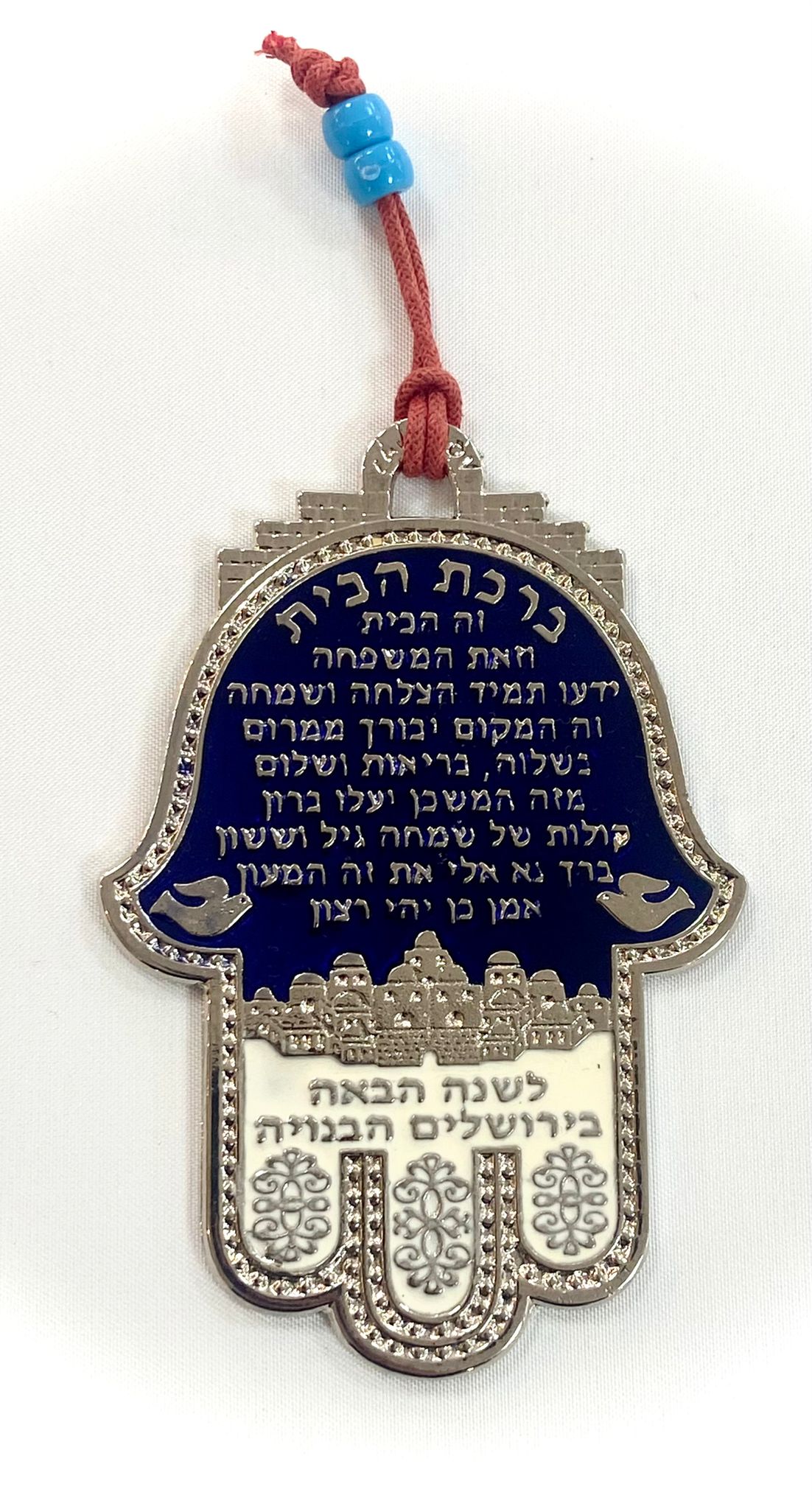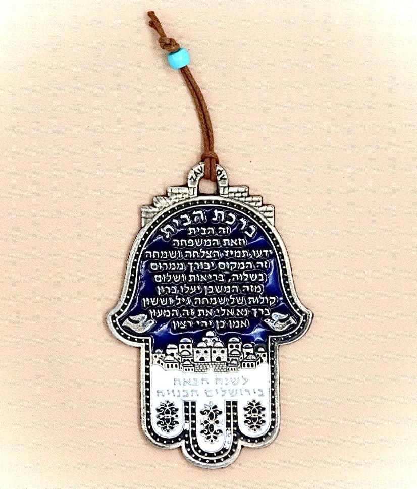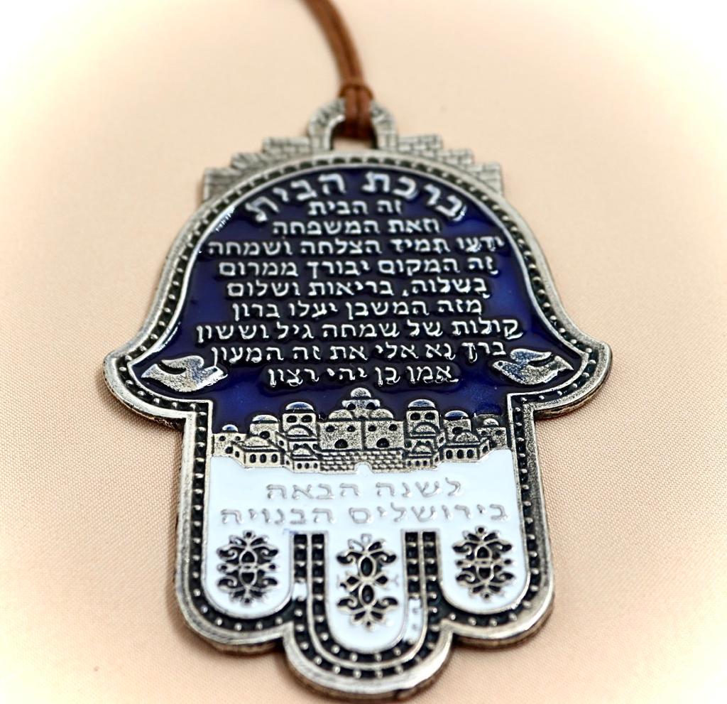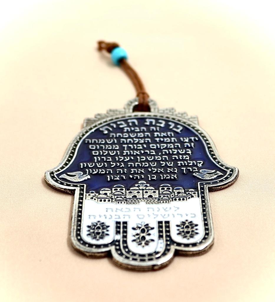 hamsa with the blessing for the home in Hebrew and a design with the city of Jerusalem
