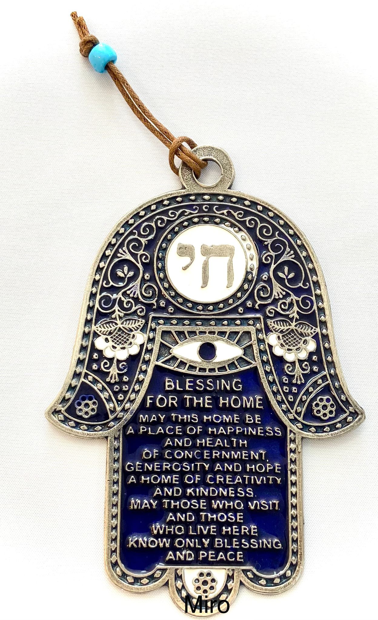 A pewter finish and enamel coloured metal Hamsa with blessing design for the home.
