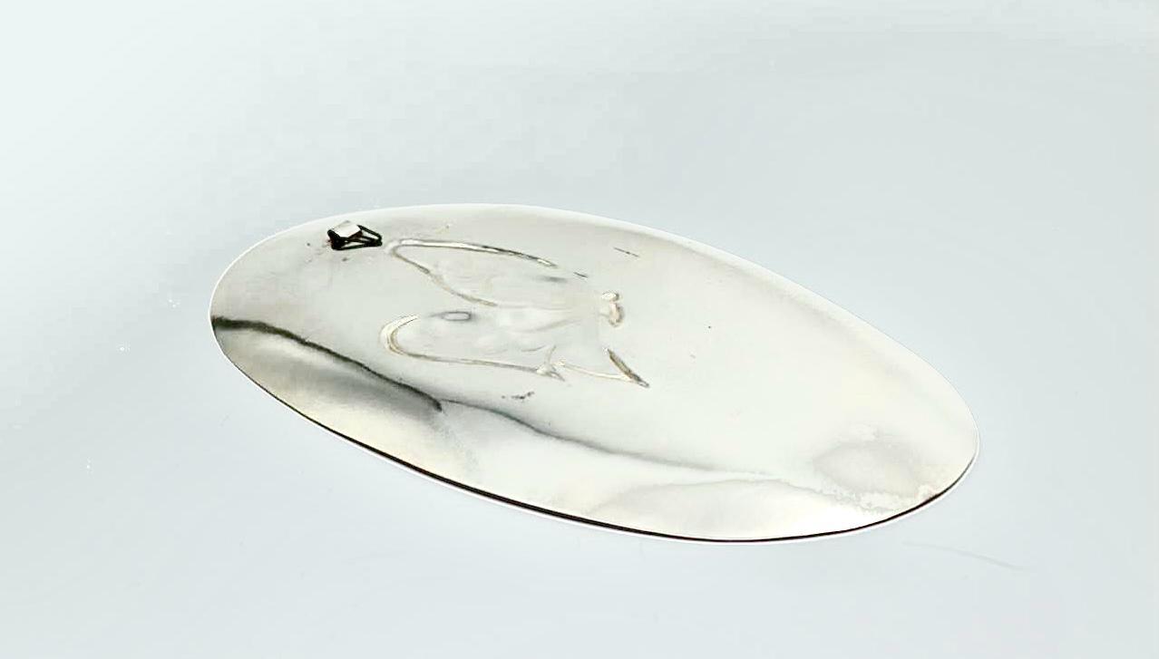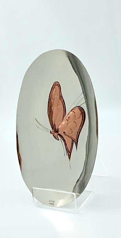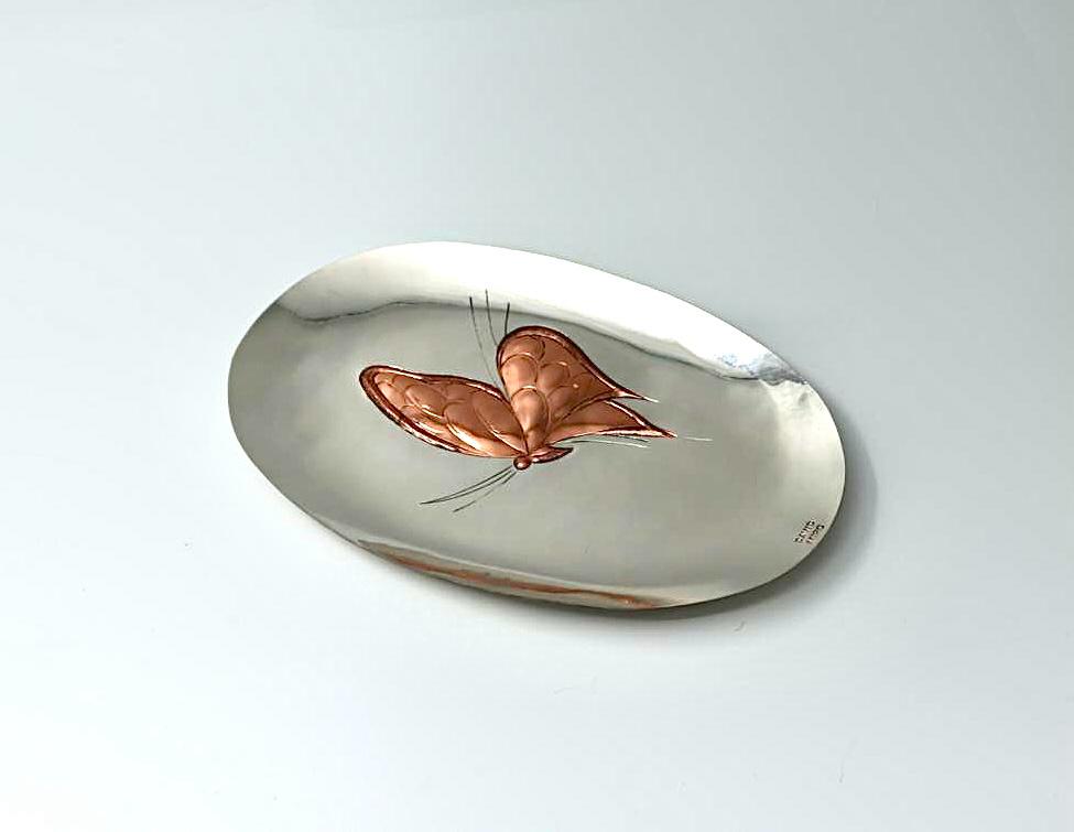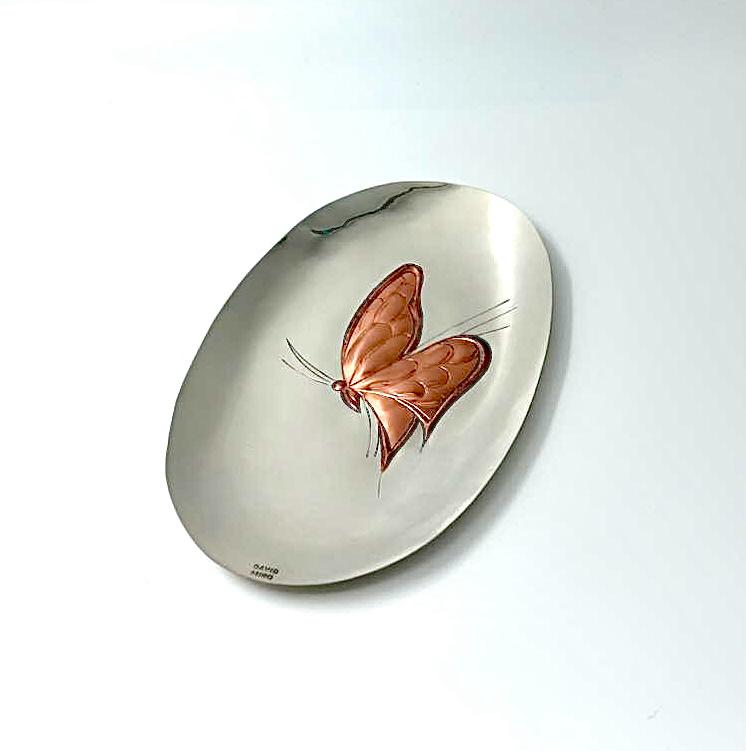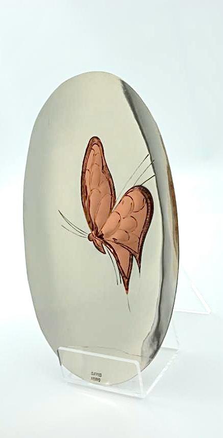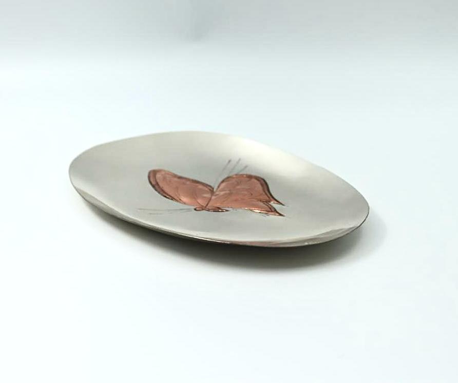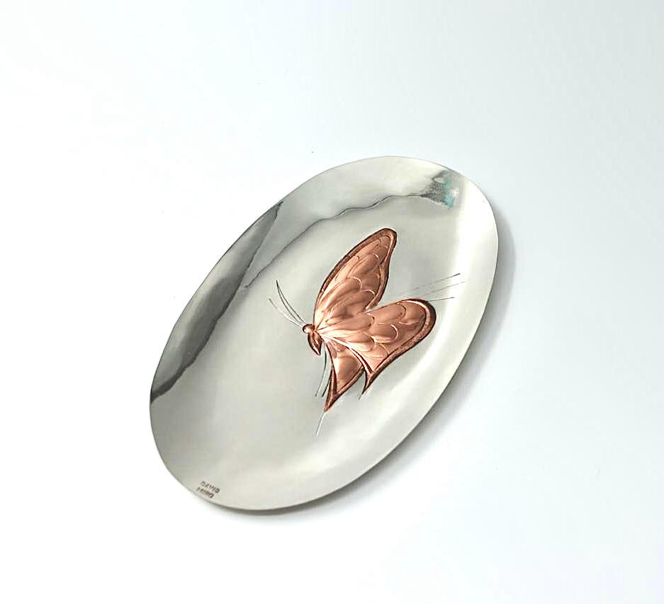 Hand made silver plated copper engraving of a butterfly, hand made by David Miro and Sons.