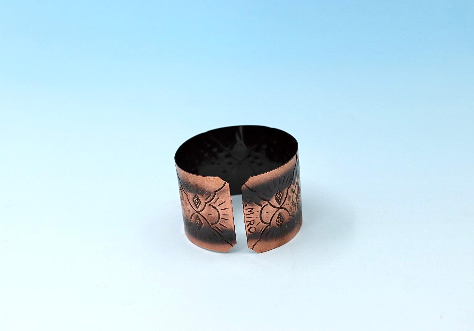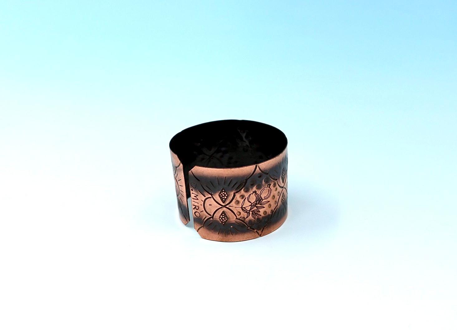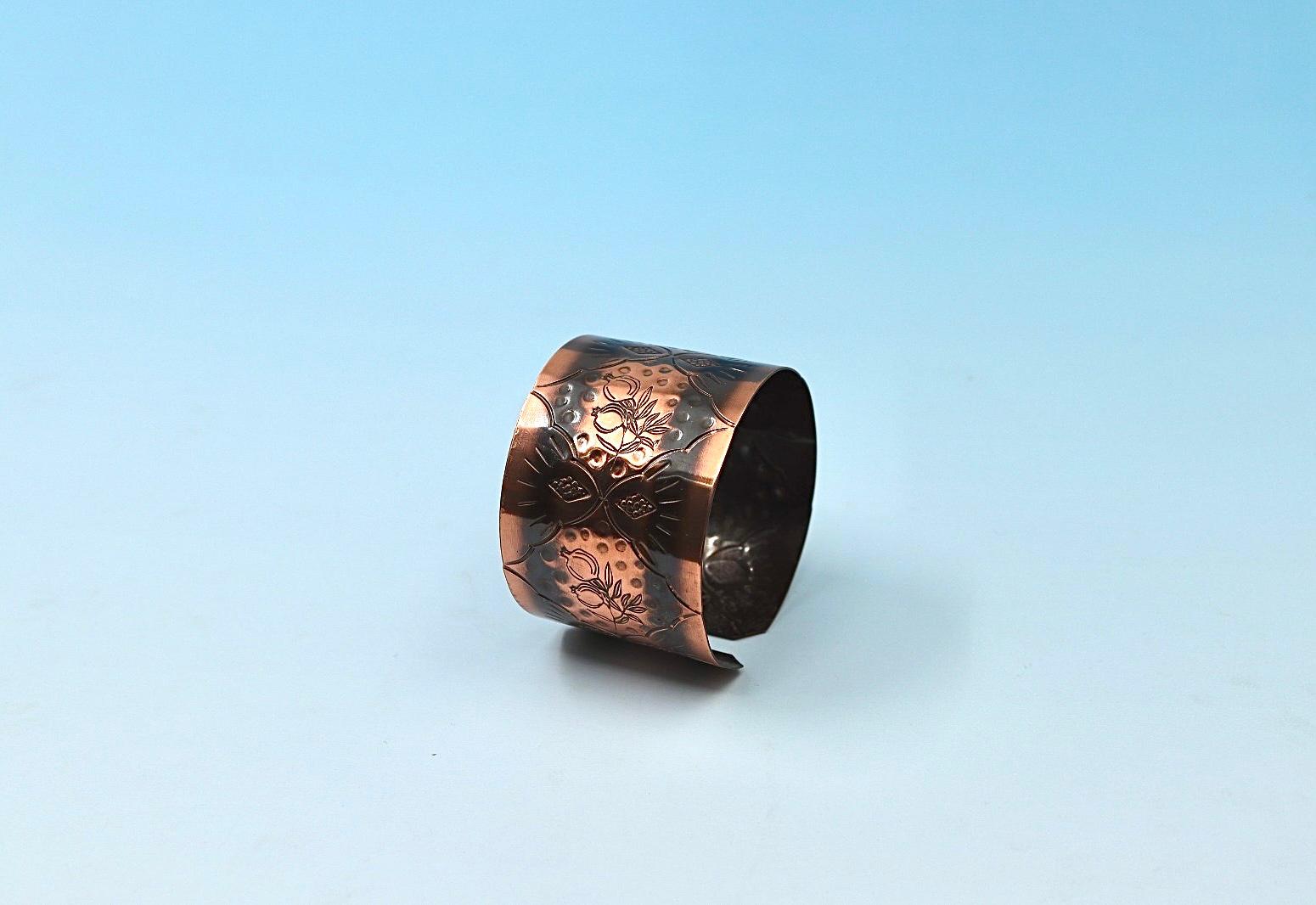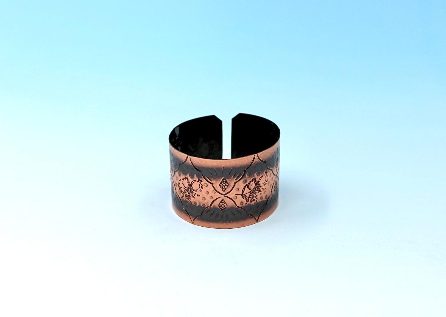 A handmade oxides copper bracelet, with Pomegranates design. Lacquered and heated in the oven to prevent blackening