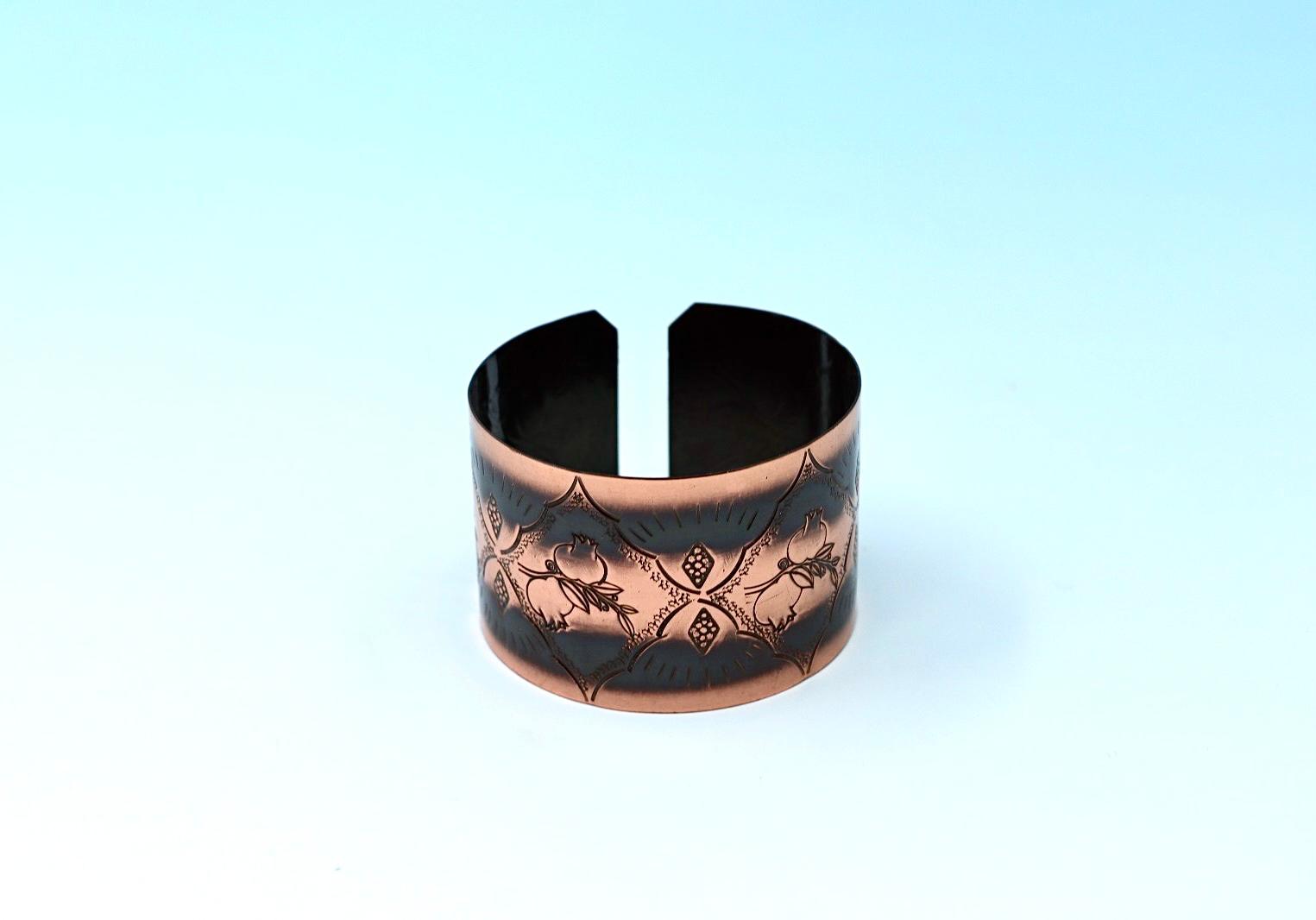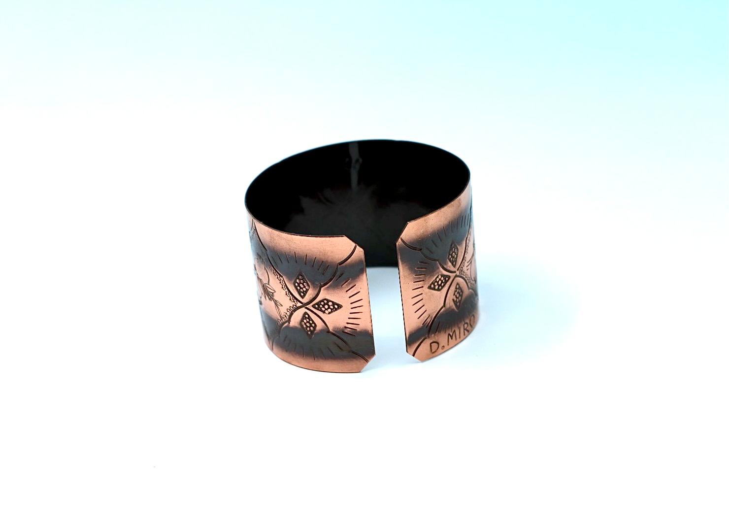 A handmade oxides copper bracelet, with Pomegranates design. Lacquered and heated in the oven to prevent blackening
