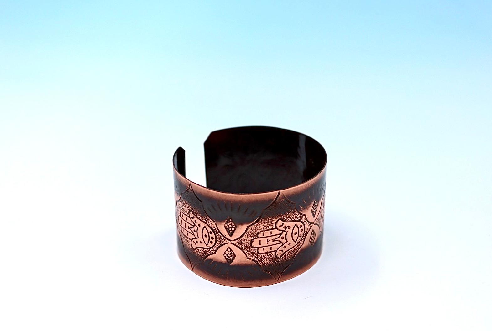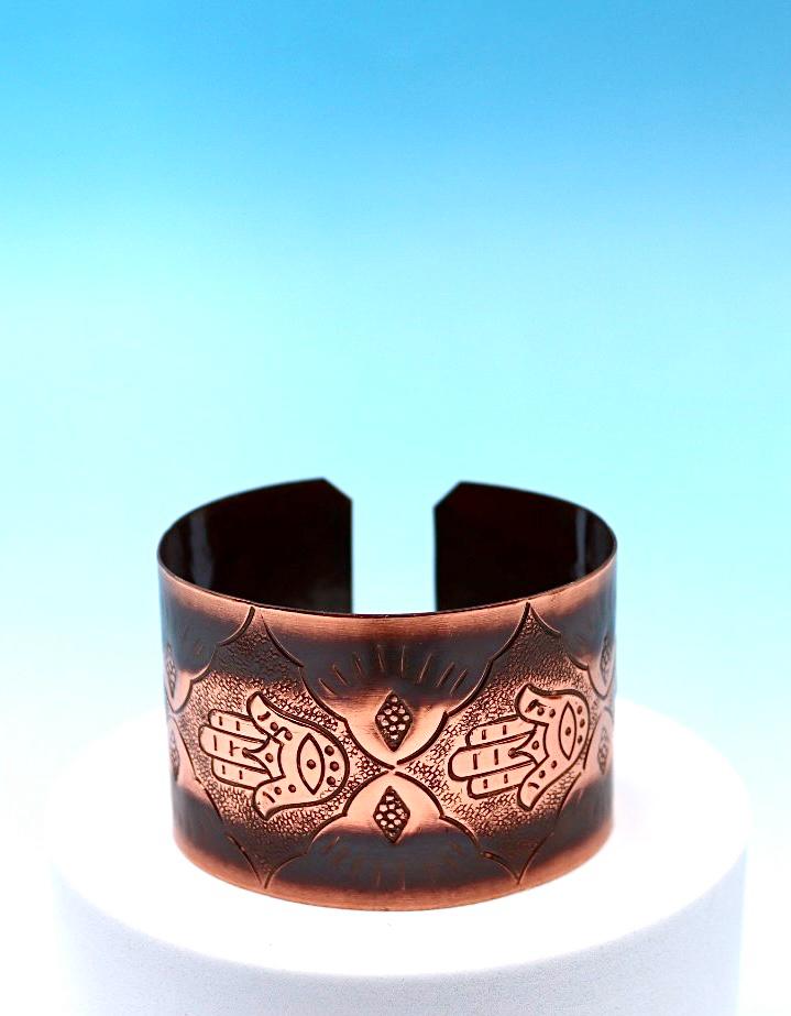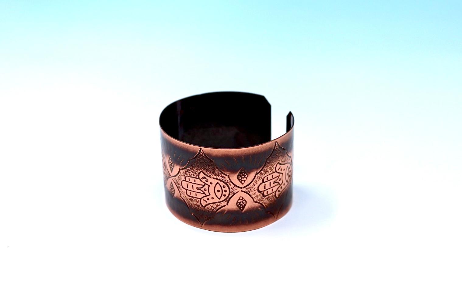 A handmade copper bracelet, with Hamsa design. Lacquered and heated in the oven to prevent blackening