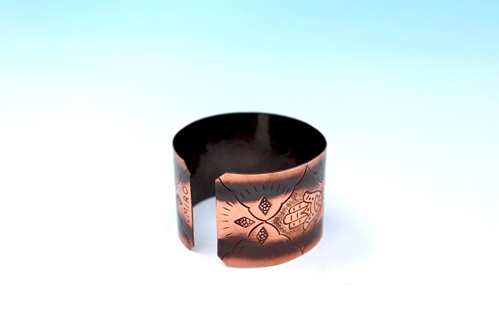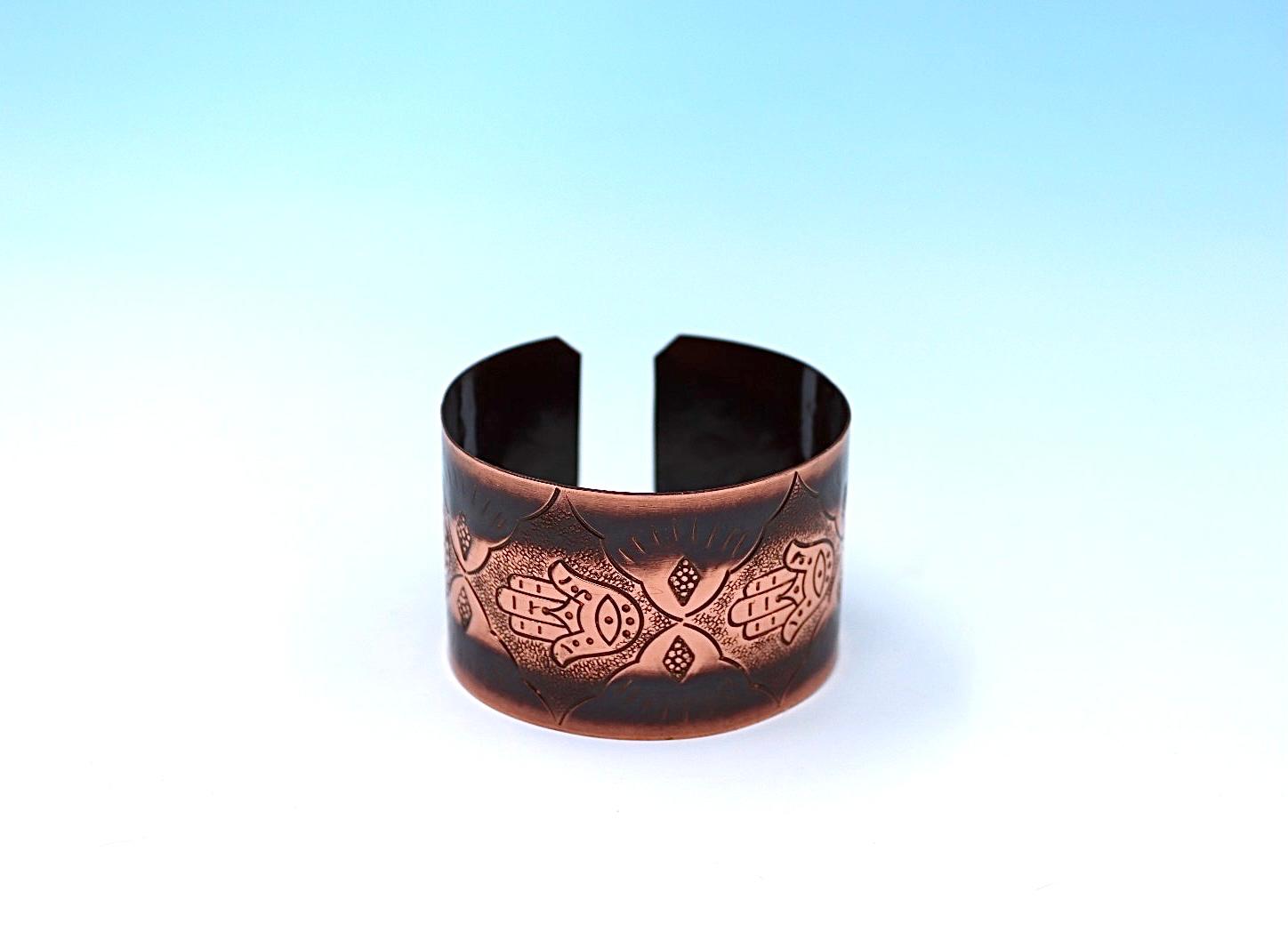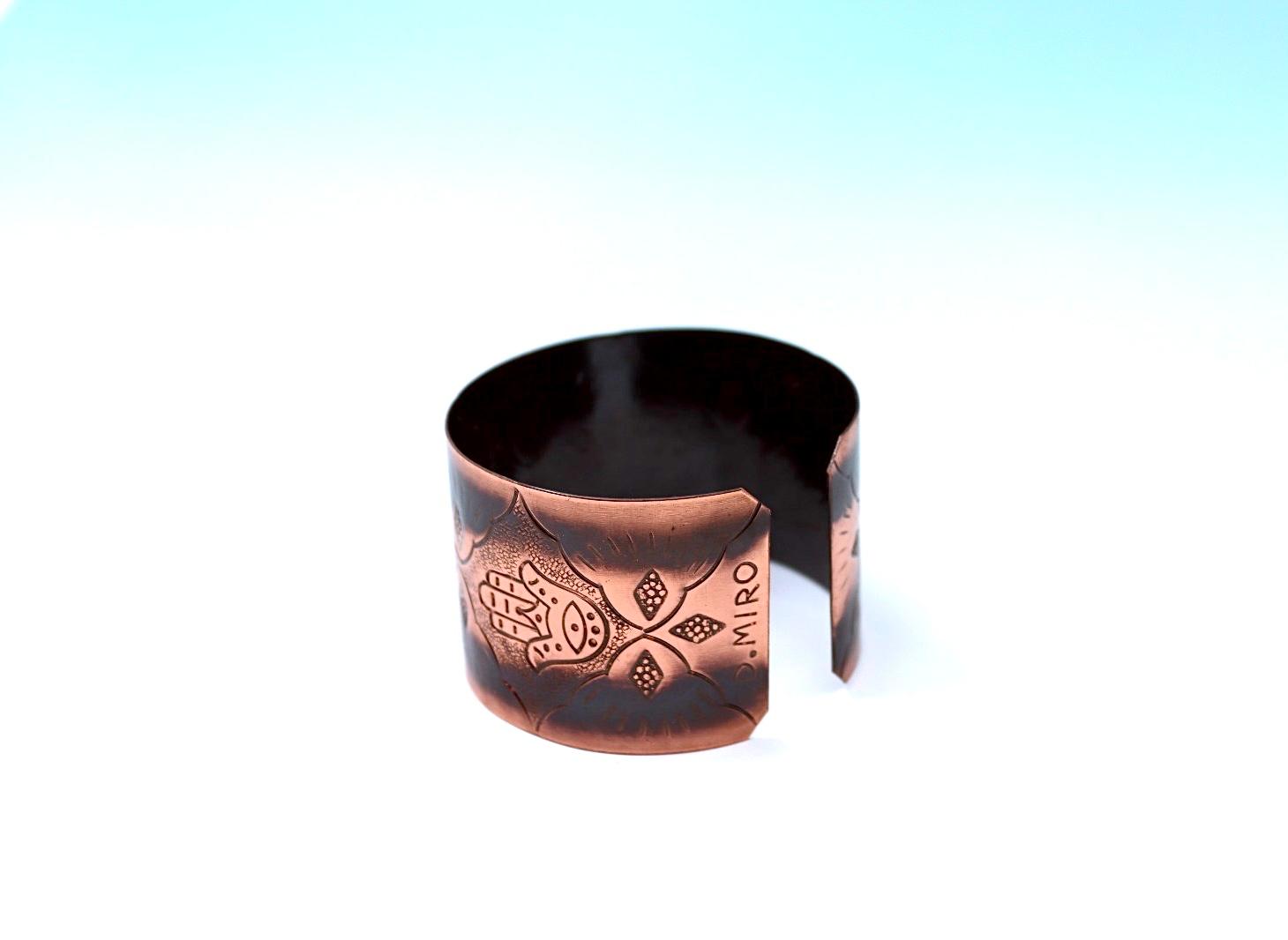 A handmade copper bracelet, with Hamsa design. Lacquered and heated in the oven to prevent blackening