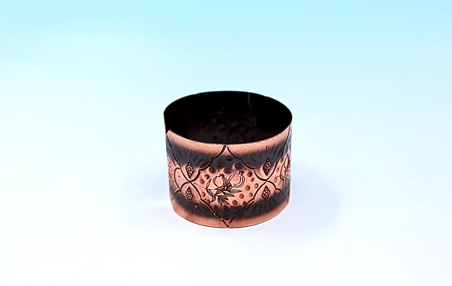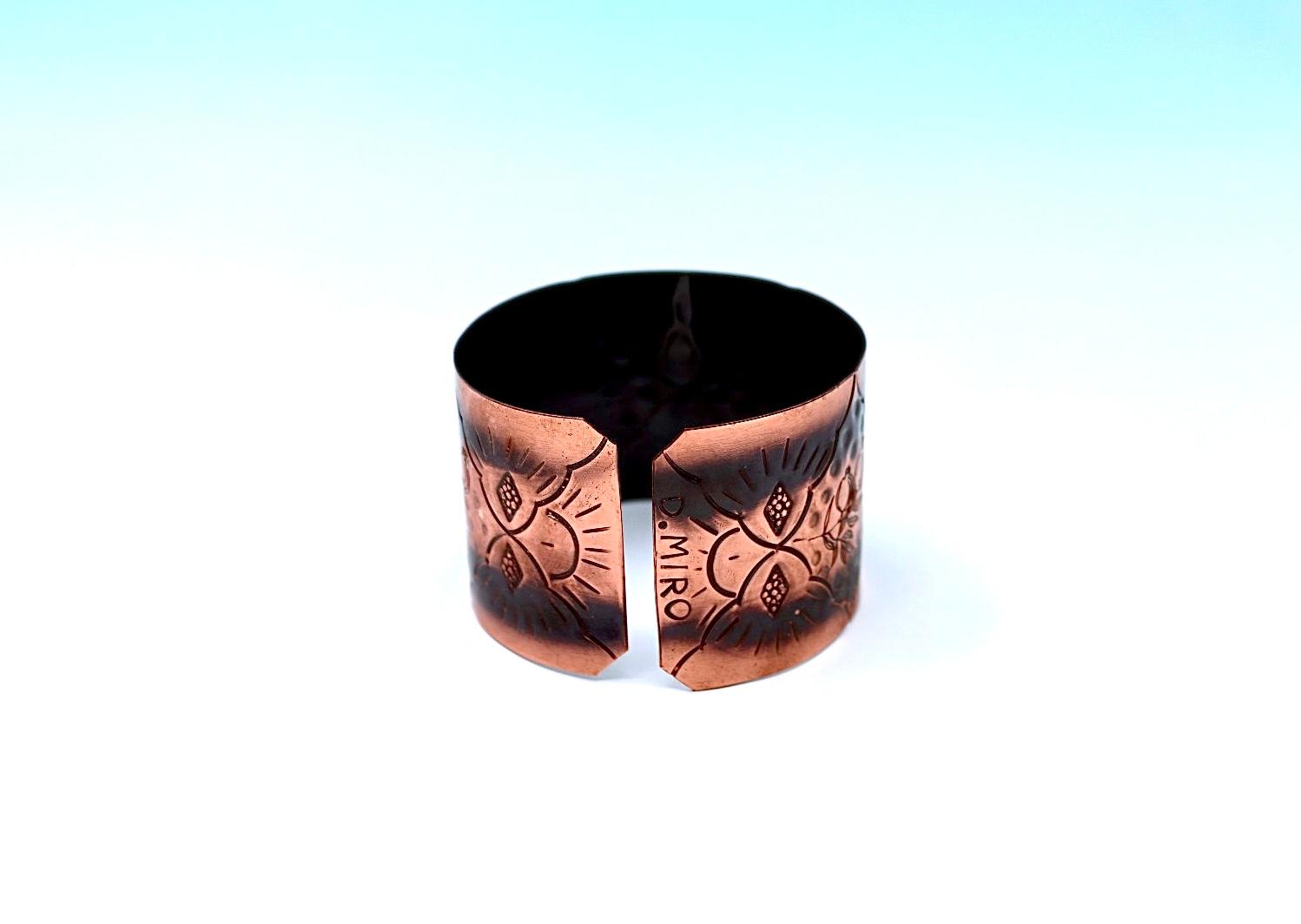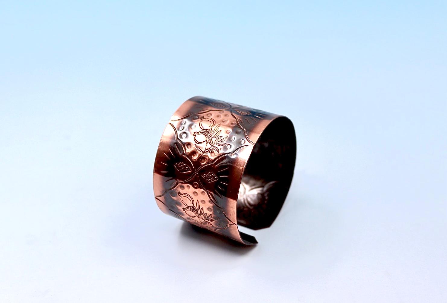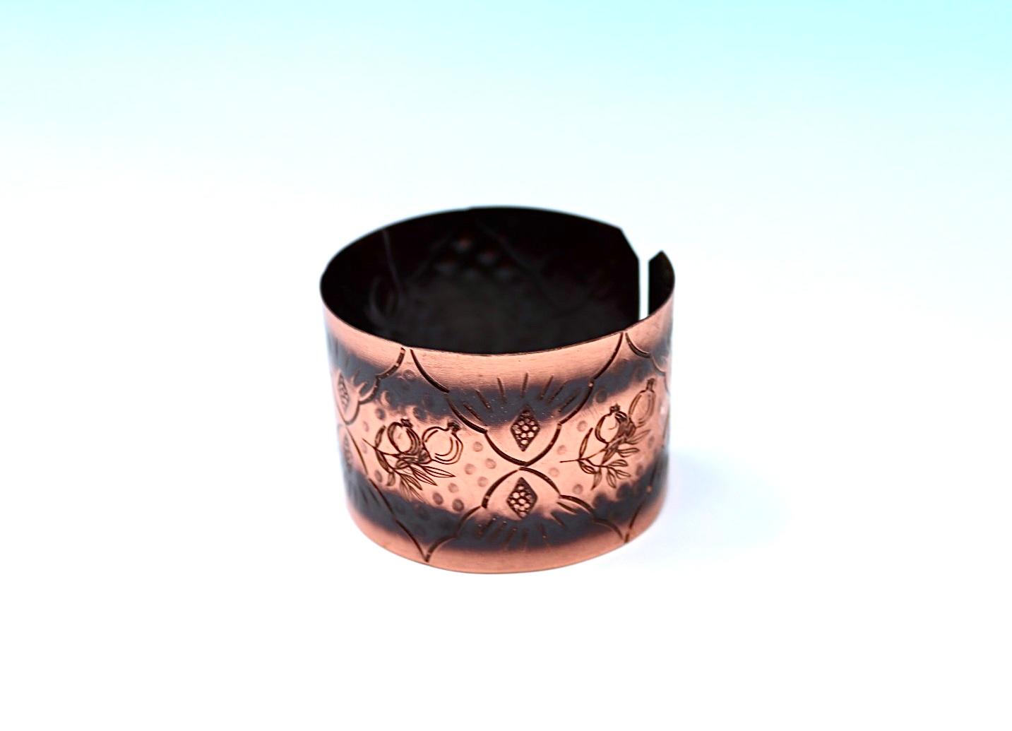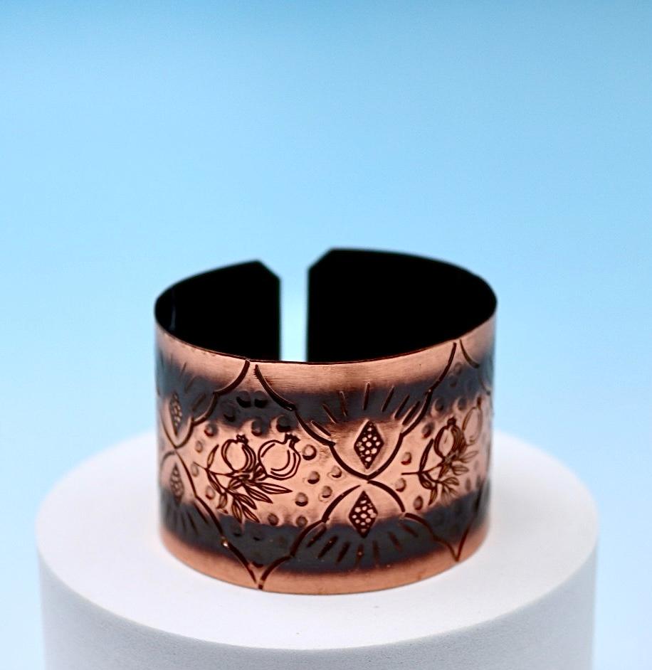 A handmade copper bracelet, with Pomegranates design. Lacquered and heated in the oven to prevent blackening
