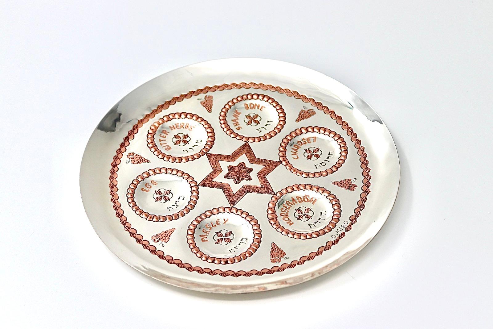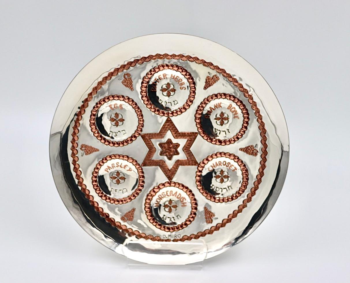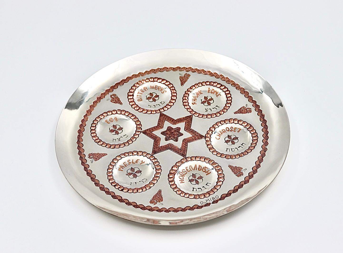 A hammered copper Passover Seder plate with silver plating. Lacquered and heated in an oven to prevent blackening.