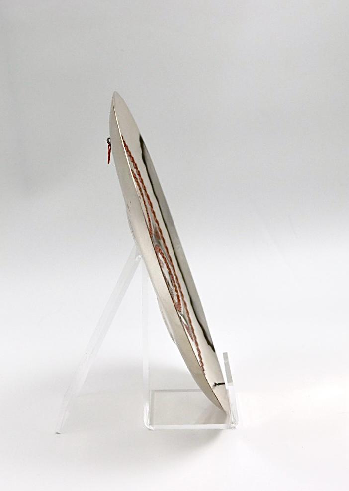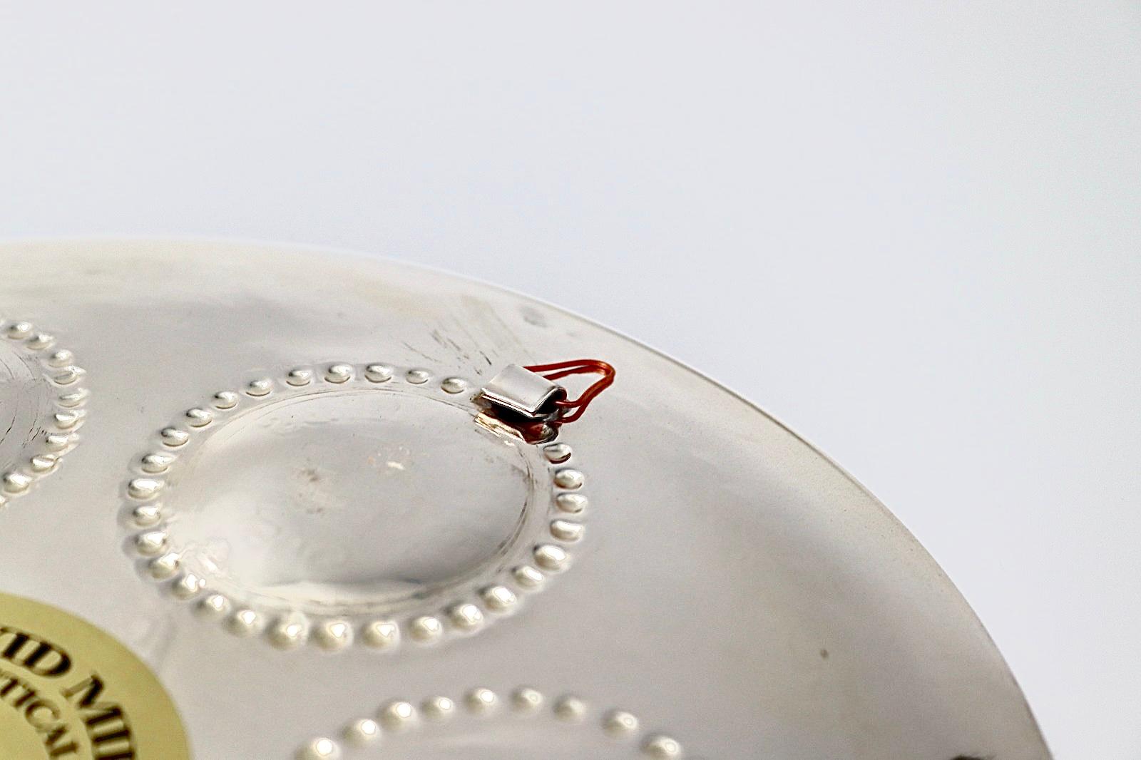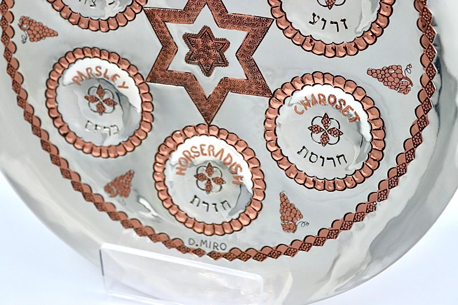 A hammered copper Passover Seder plate with silver plating. Lacquered and heated in an oven to prevent blackening.