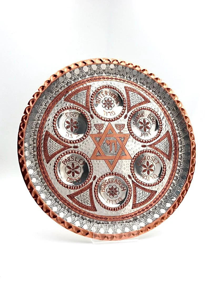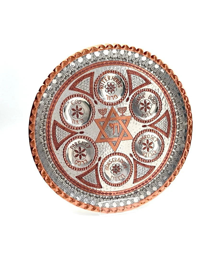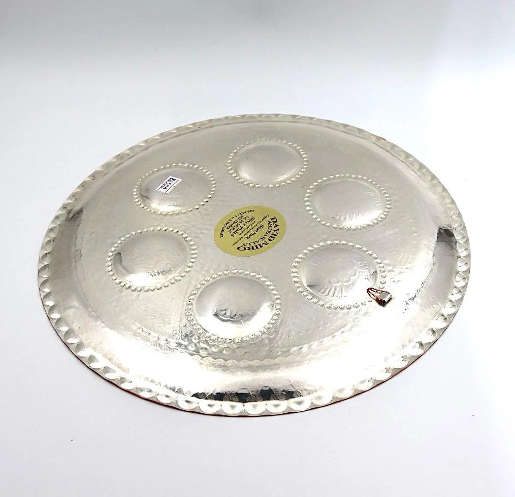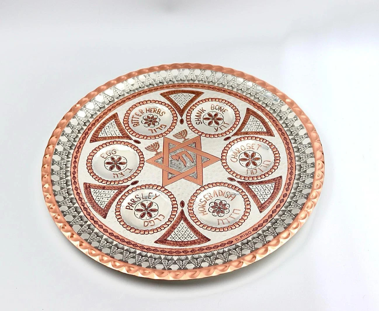 A hammered copper Passover Seder plate with silver plating. Lacquered and heated in an oven to prevent blackening.