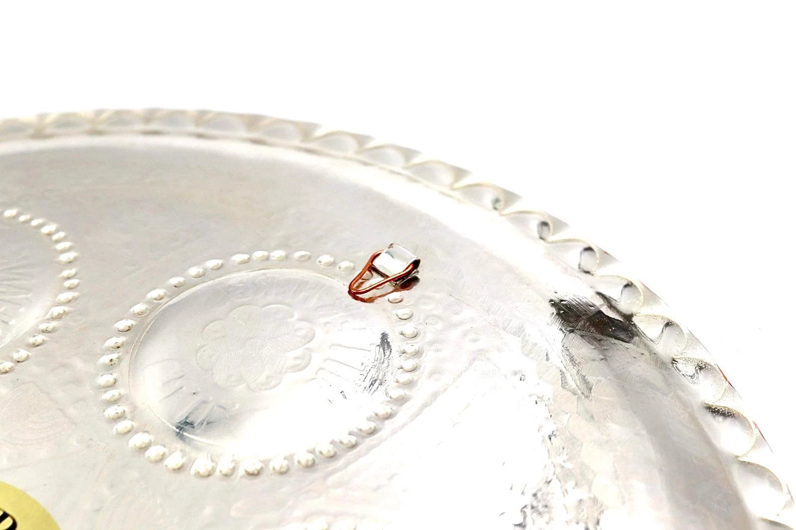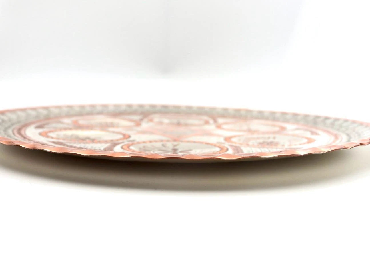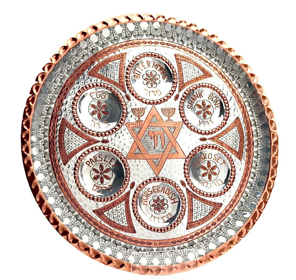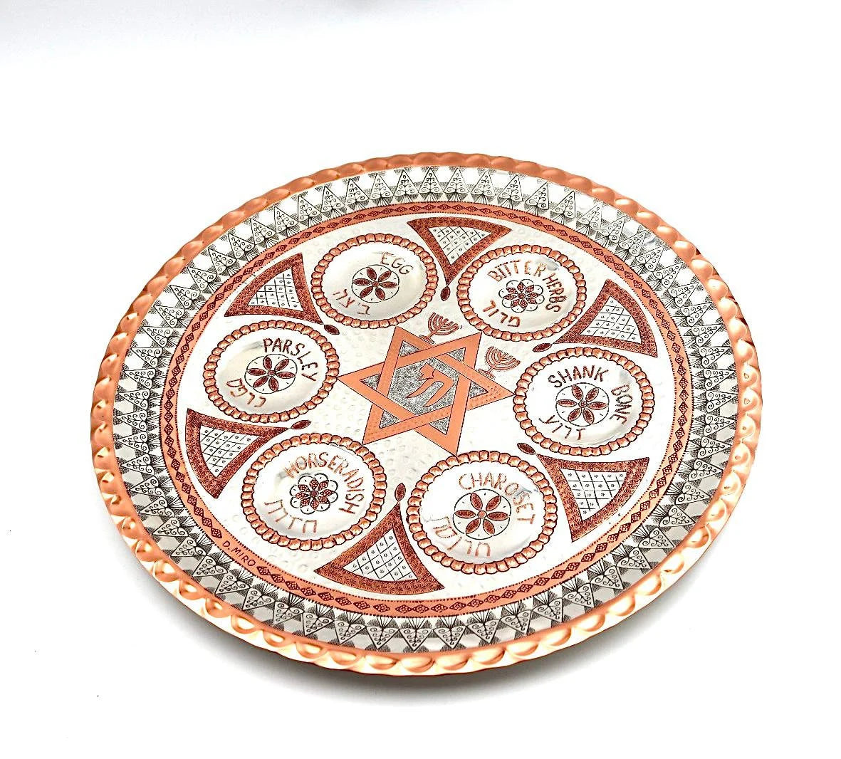A hammered copper Passover Seder plate with silver plating. Lacquered and heated in an oven to prevent blackening.