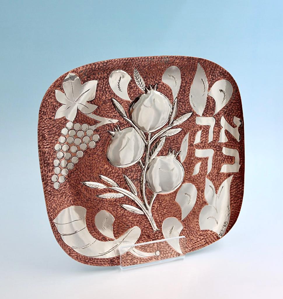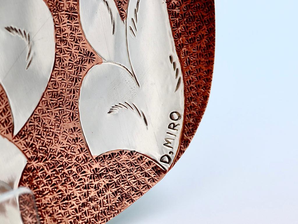 Unique copper hammering. The pomegranates are prominent and the rest is flat.