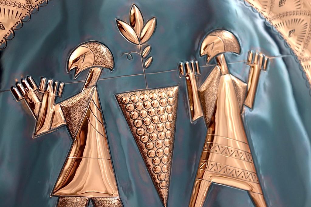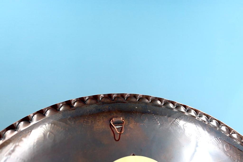 Made of copper, partially blackened, coated with lacquer and heated in the oven to prevent blackening.
