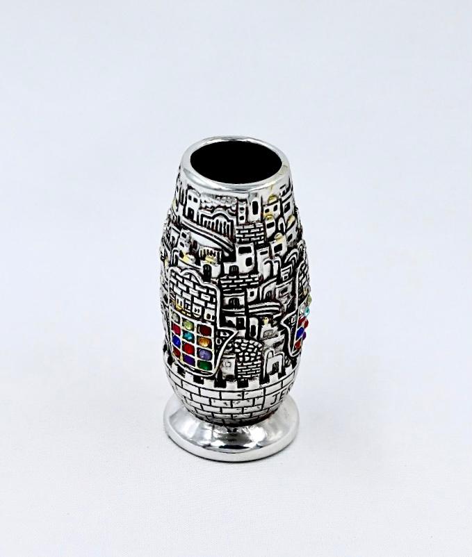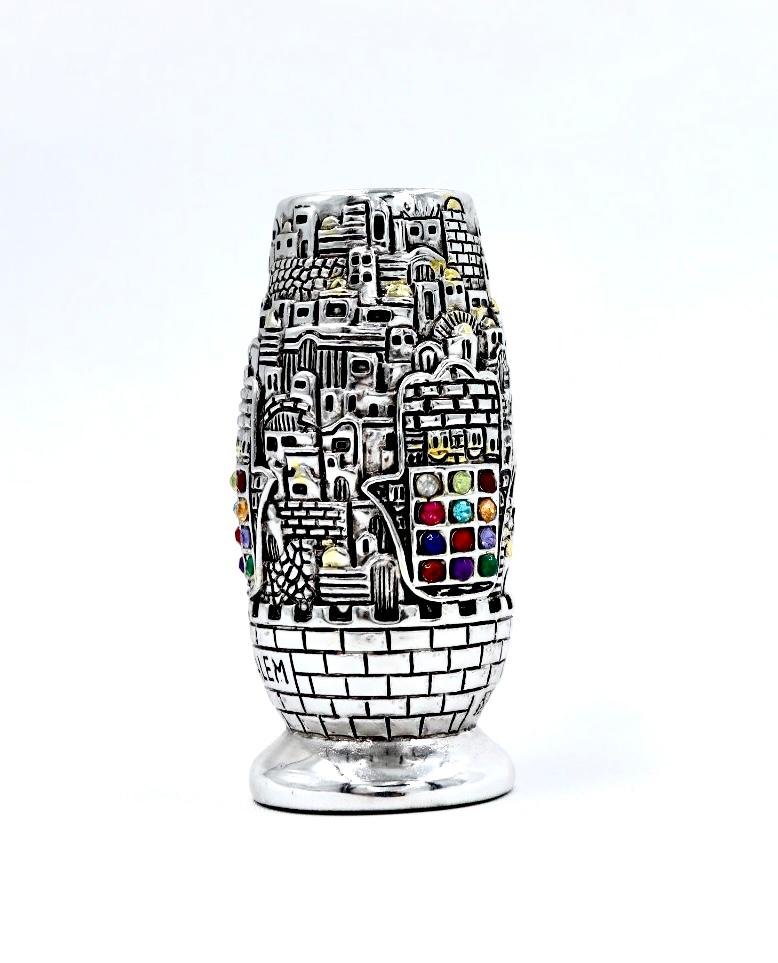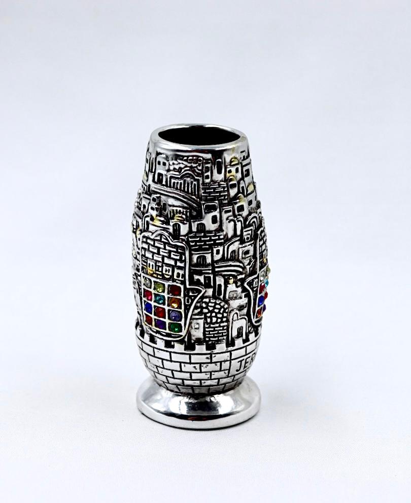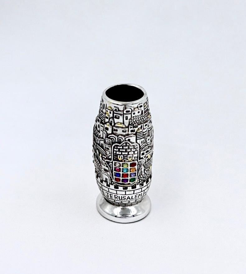 A silver toothpick stand with a view of Jerusalem