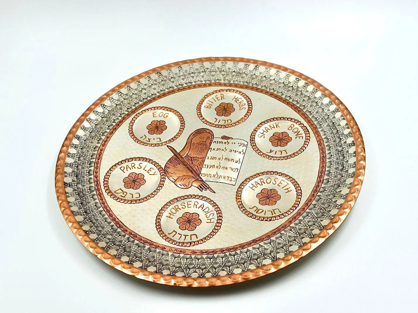 Unique handmade Passover plate. Handmade embroidery on copper and silver of a Passover plate, not blackened. Made by David Miro.
