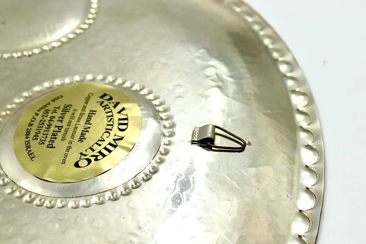 A hammered copper Passover Seder plate with silver plating. Lacquered and heated in an oven to prevent blackening.